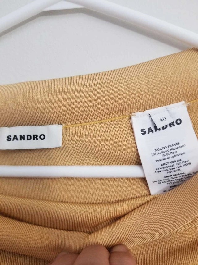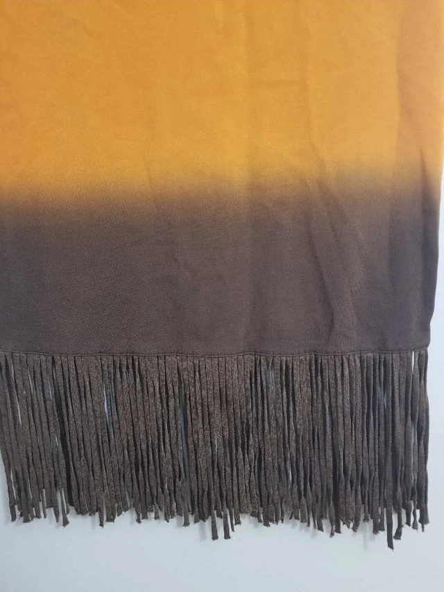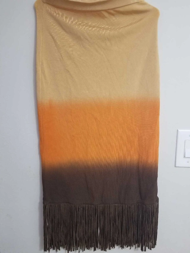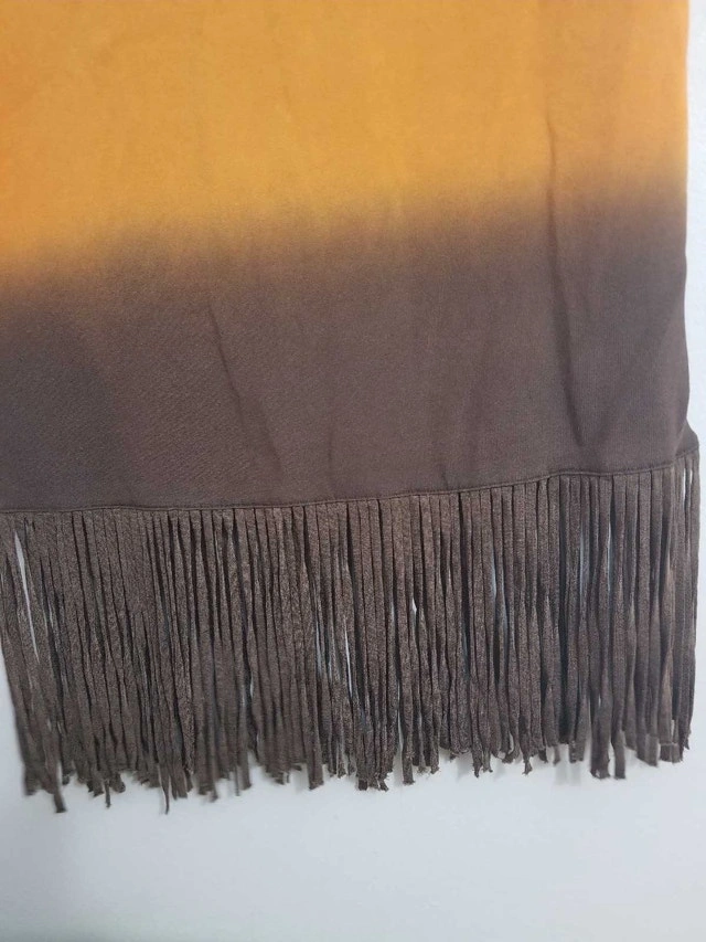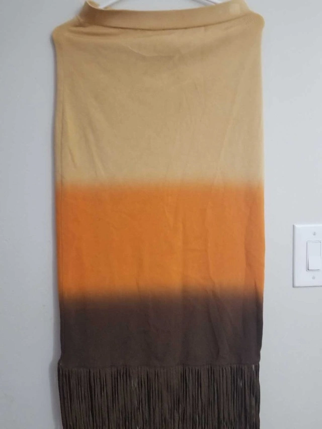 This Sandro skirt features a stylish ombre design in shades of tan, orange, and brown, complete with fringe at the bottom and an elastic waist. Although it's previously owned, it remains in good condition, offering a unique addition to your wardrobe. Perfect for adding a touch of bohemian flair to any outfit! If the ad is up, it's available! Best offers welcome.
