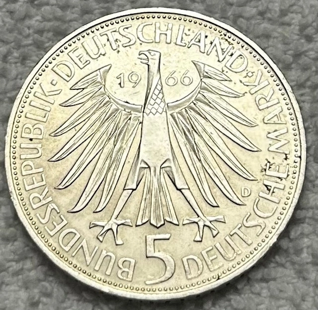 I'm offering a collection of three 5 Deutschmark silver coins, each with unique historical significance. These coins are from West Germany, minted in 1966, 1974, and 1971 respectively. They are in amazing condition and are made of .625% Silver. They are a great addition to any collection. Cash accepted.