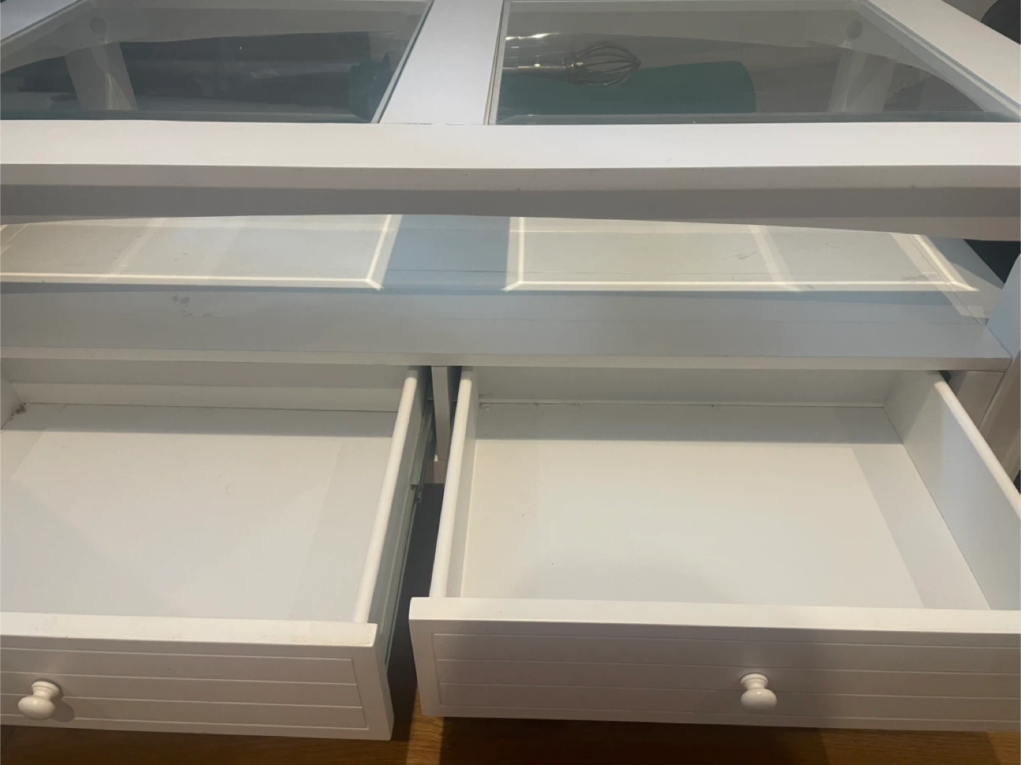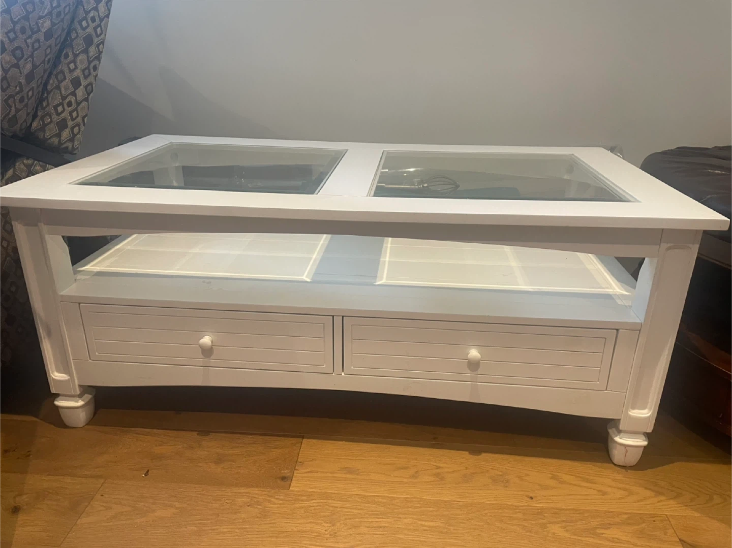 A white coffee table featuring a glass top and two drawers for storage. It's made of wood and has a shelf beneath the drawers. The table measures approximately 48 inches long and 24 inches wide. Ikea Idanas coffee table $399+ tax in store