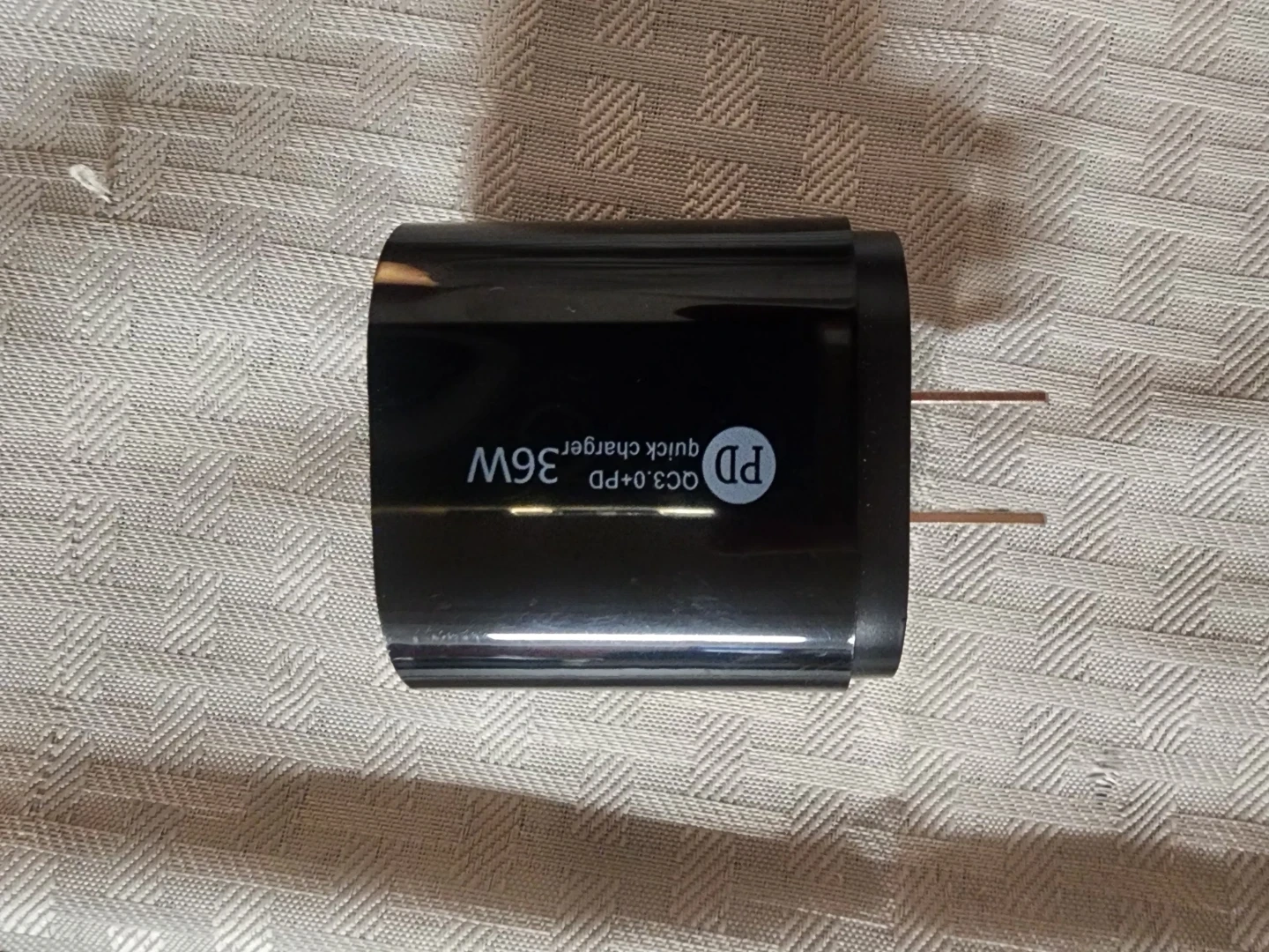 This black wall charger offers 36W of power with both a USB-C PD port and a Quick Charge 3.0 port. It supports a wide input voltage range of AC 100-204V. Model is 62-AC, made in China. Multiple devices can be charged quickly from this unit.