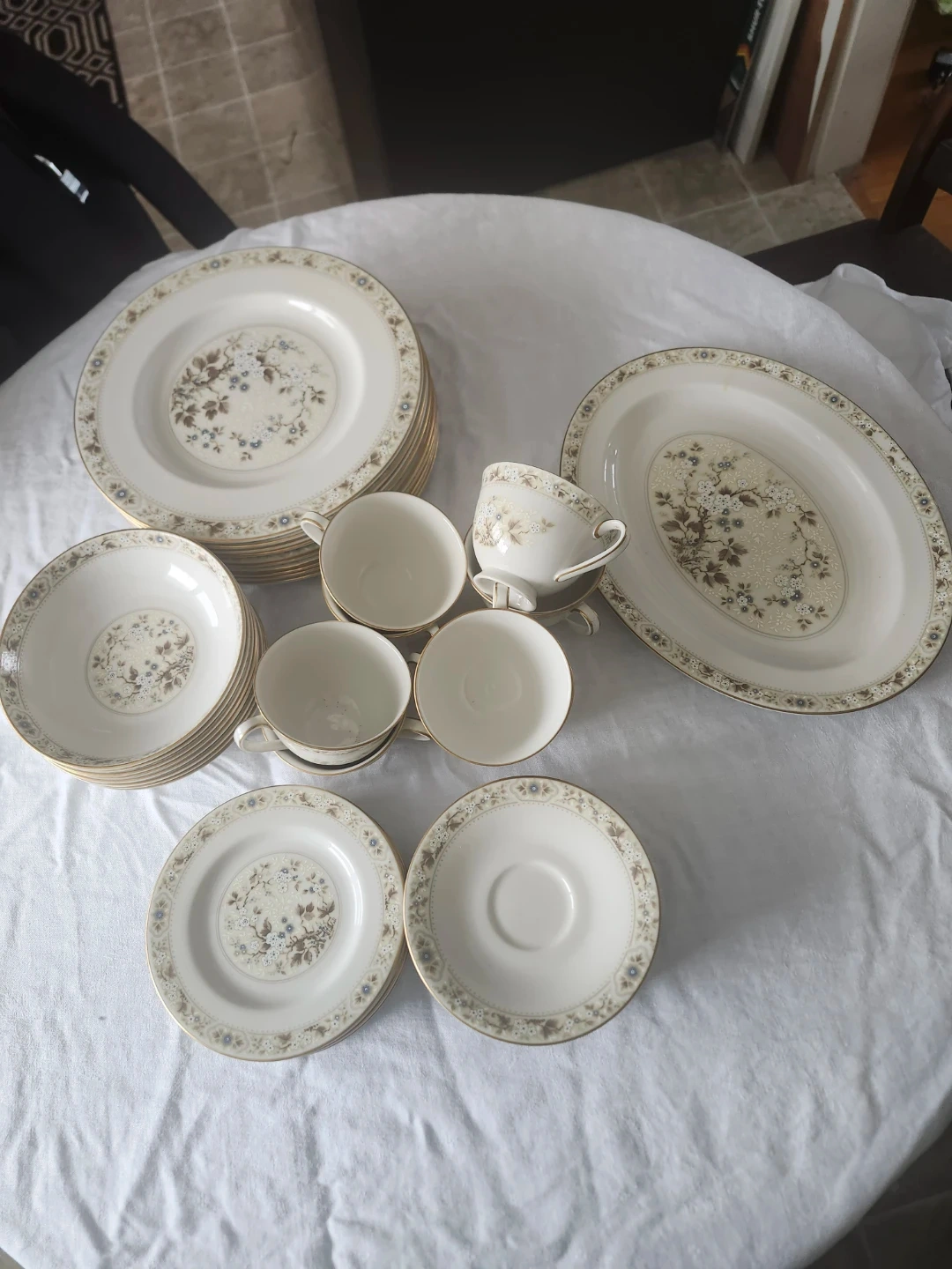 This vintage dinnerware set features a delicate floral pattern with gold trim. It includes plates, bowls, and cups with saucers. Perfect for special occasions or adding a touch of elegance to everyday meals.