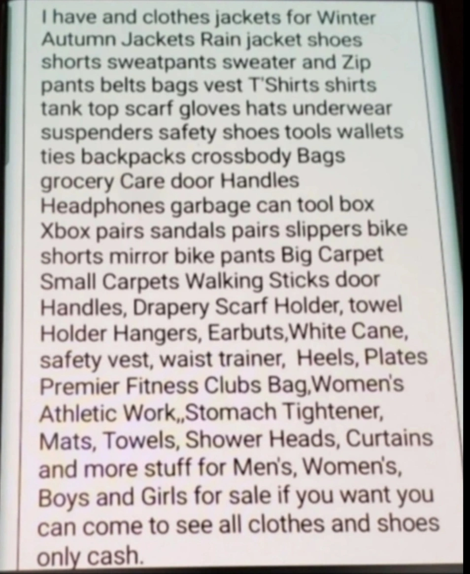 I have more Winter jackets Autumn jackets and Rain jackets for Men's and Boys for sale all size different price different colors and different Brand if you want you can come to see all clothes and jackets only cash.