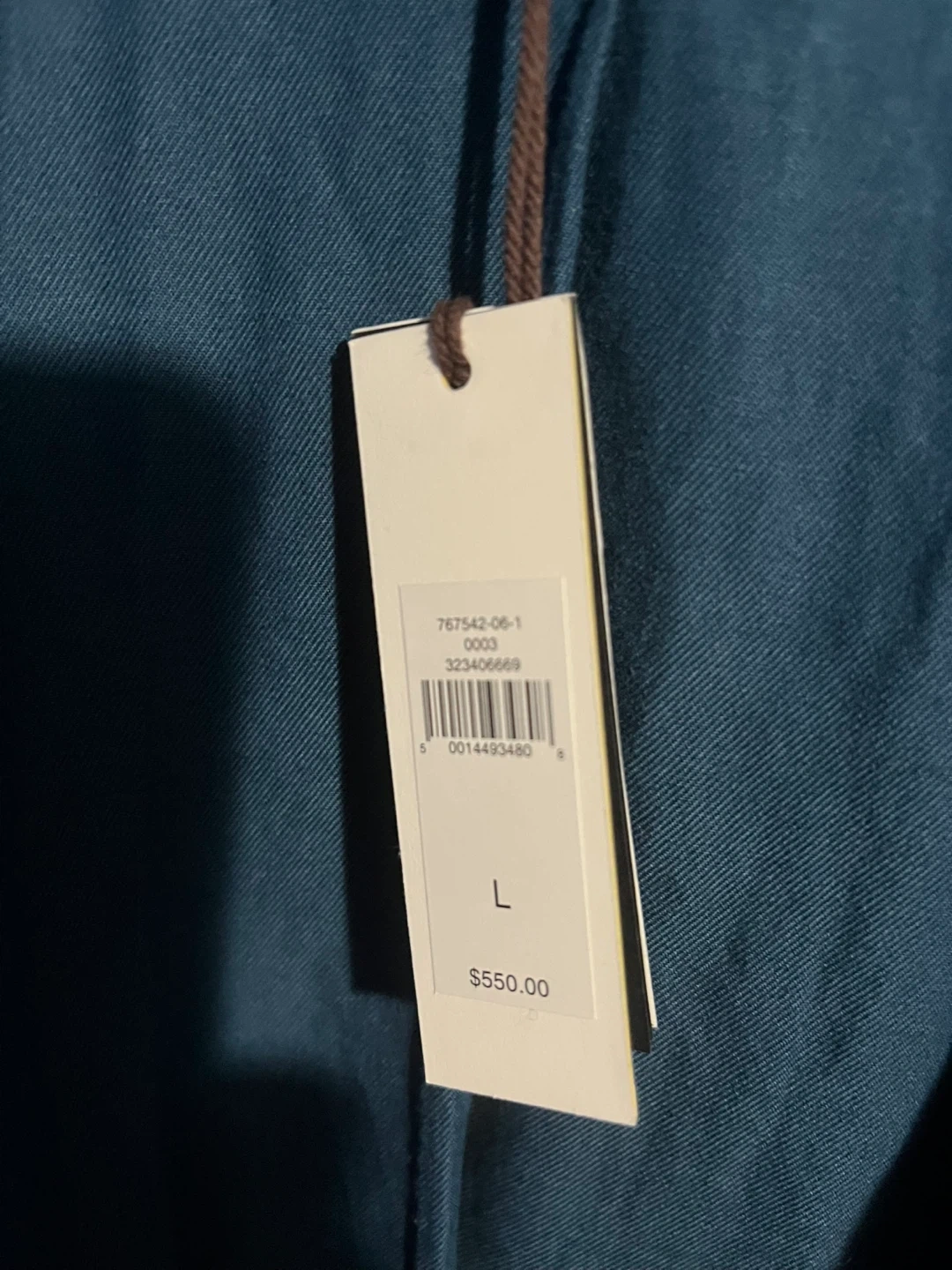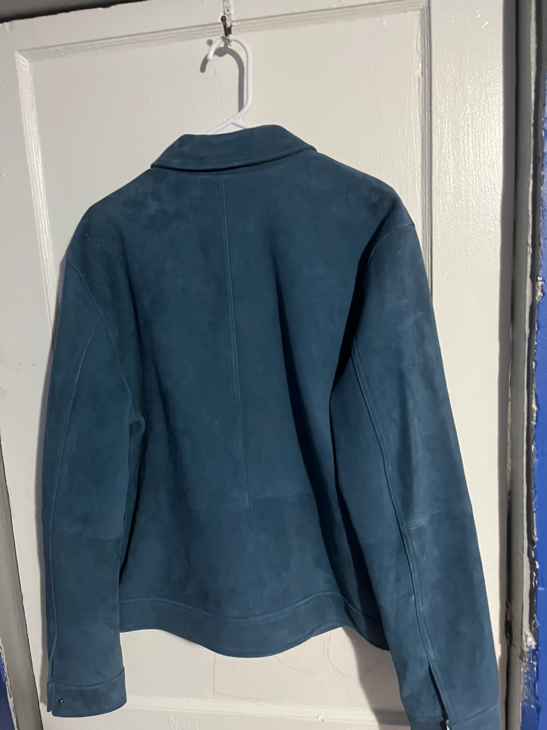 Teal suede trucker jacket from Banana Republic. It's a size large. The jacket features dual chest pockets and has an embroidered 'BR' logo on the inside. Original price was $550.00!