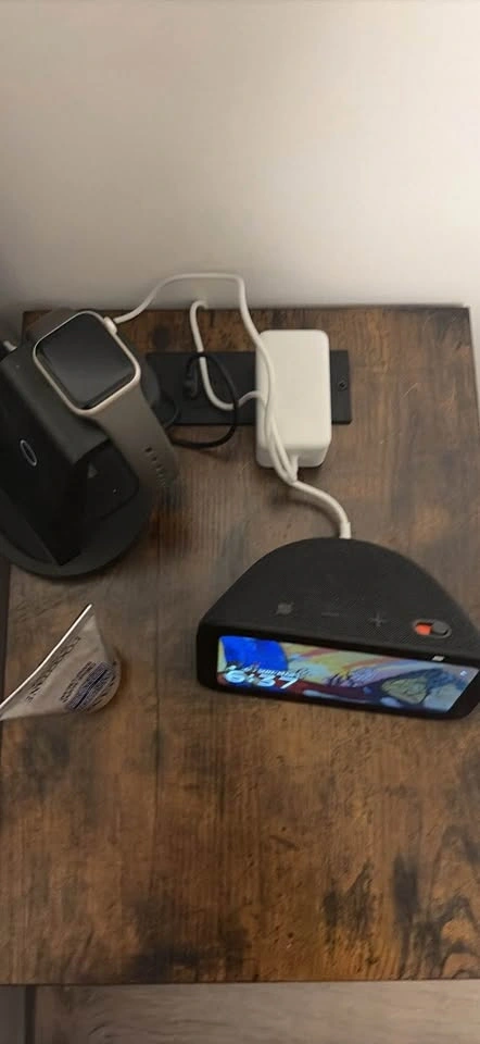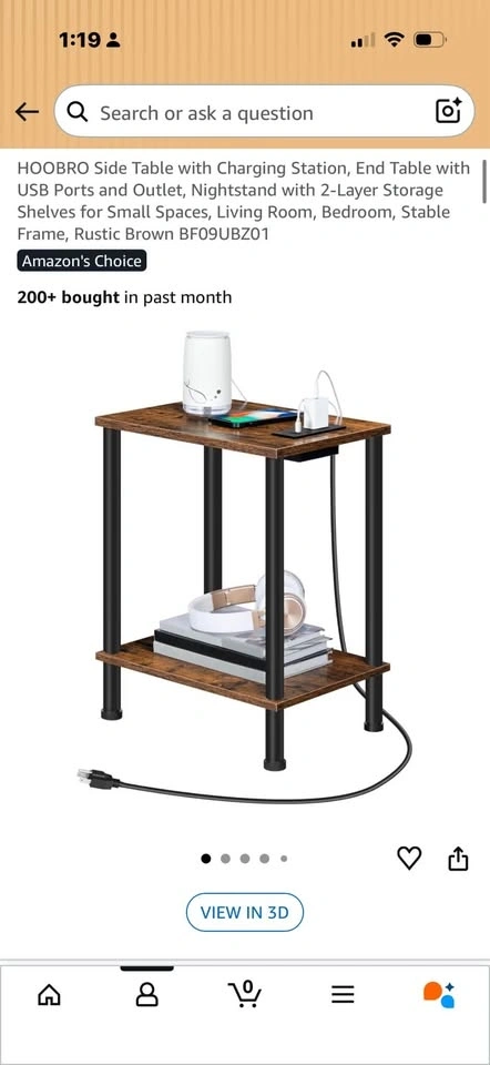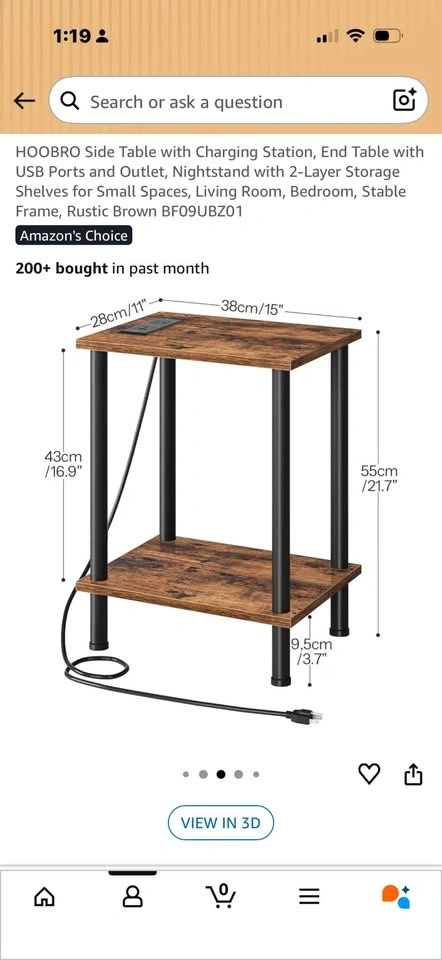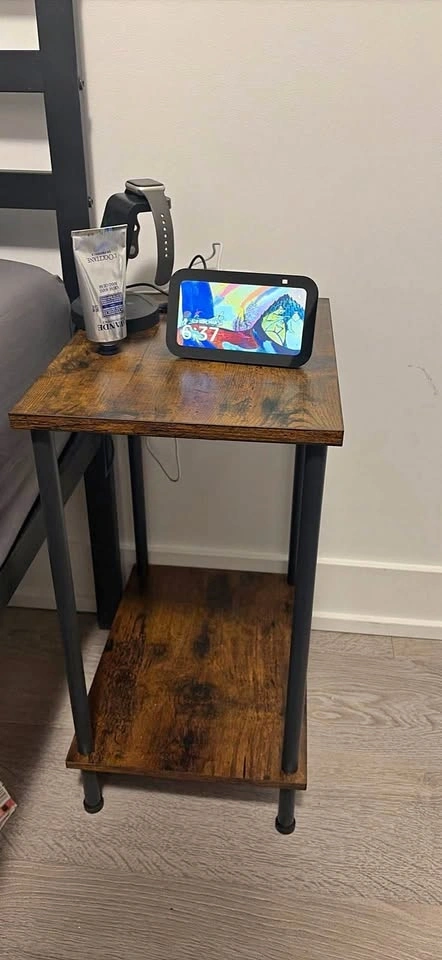 Stylish 2-tier side table. Has a rustic wood-look top and lower shelf. Black metal frame. Great as a nightstand or for living room.
