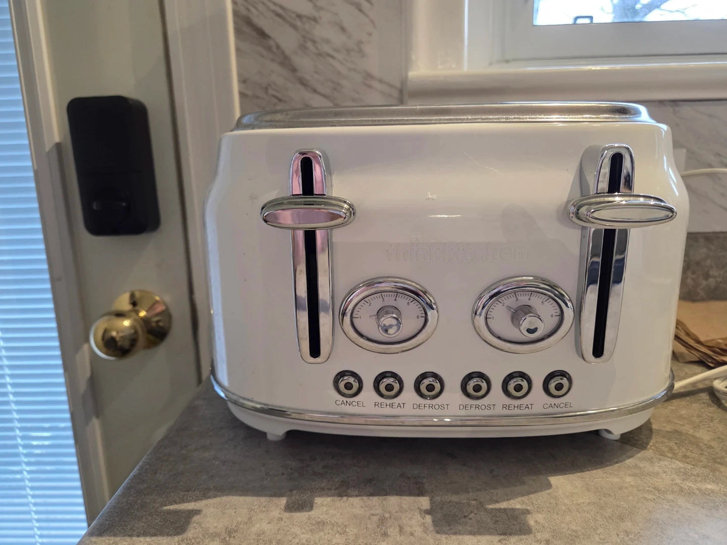 This white Retro style Thinkkitchen 4-slice toaster has reheat and defrost functions. It features a sleek design with chrome accents. Perfect for busy mornings!