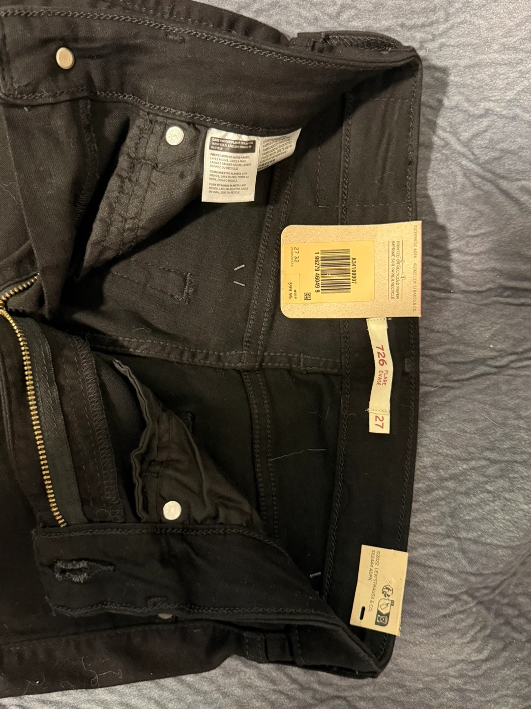 These are brand new black flare jeans from Levi's. They're a size 27 with a 32 inseam. These jeans are made with a stretch denim blend for comfort.