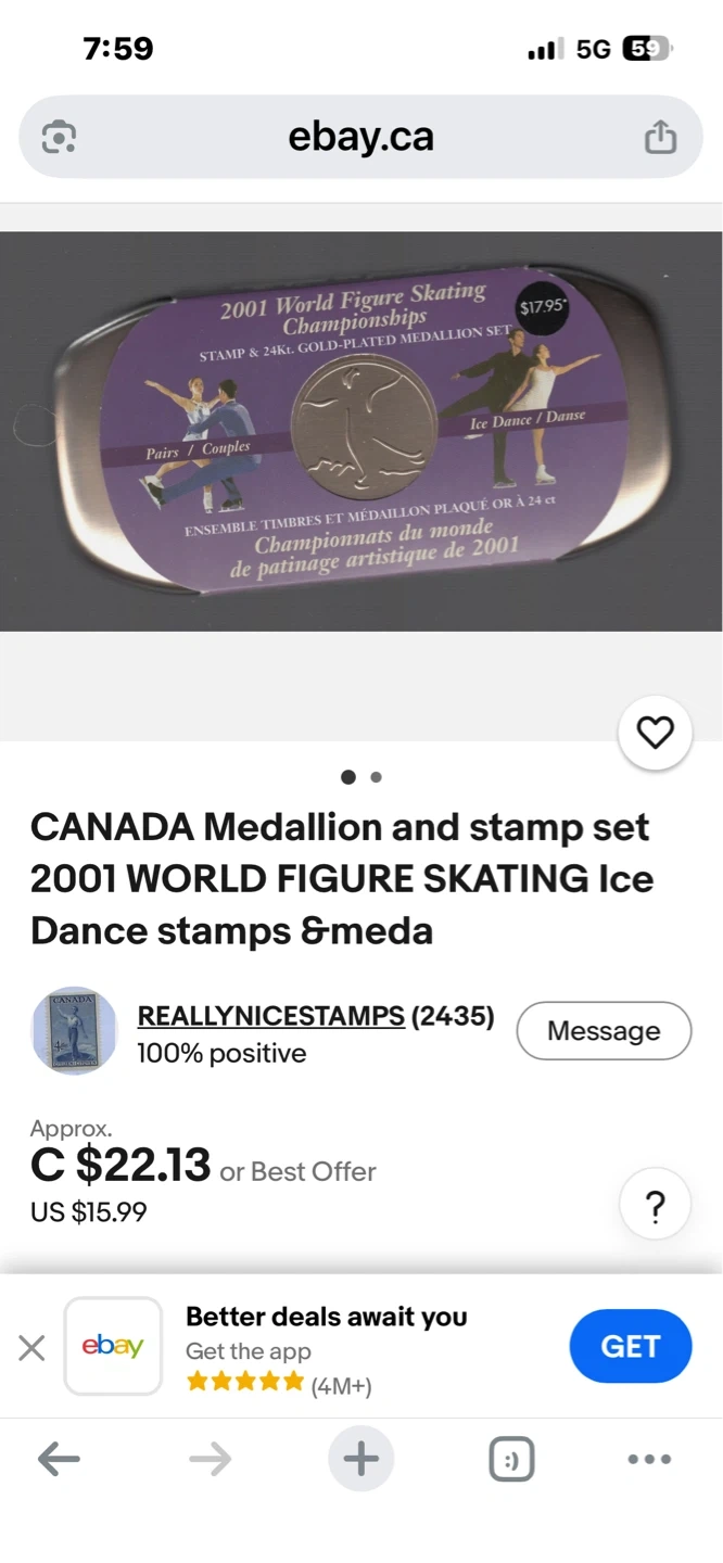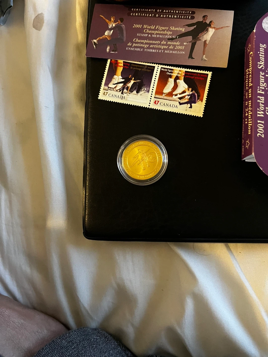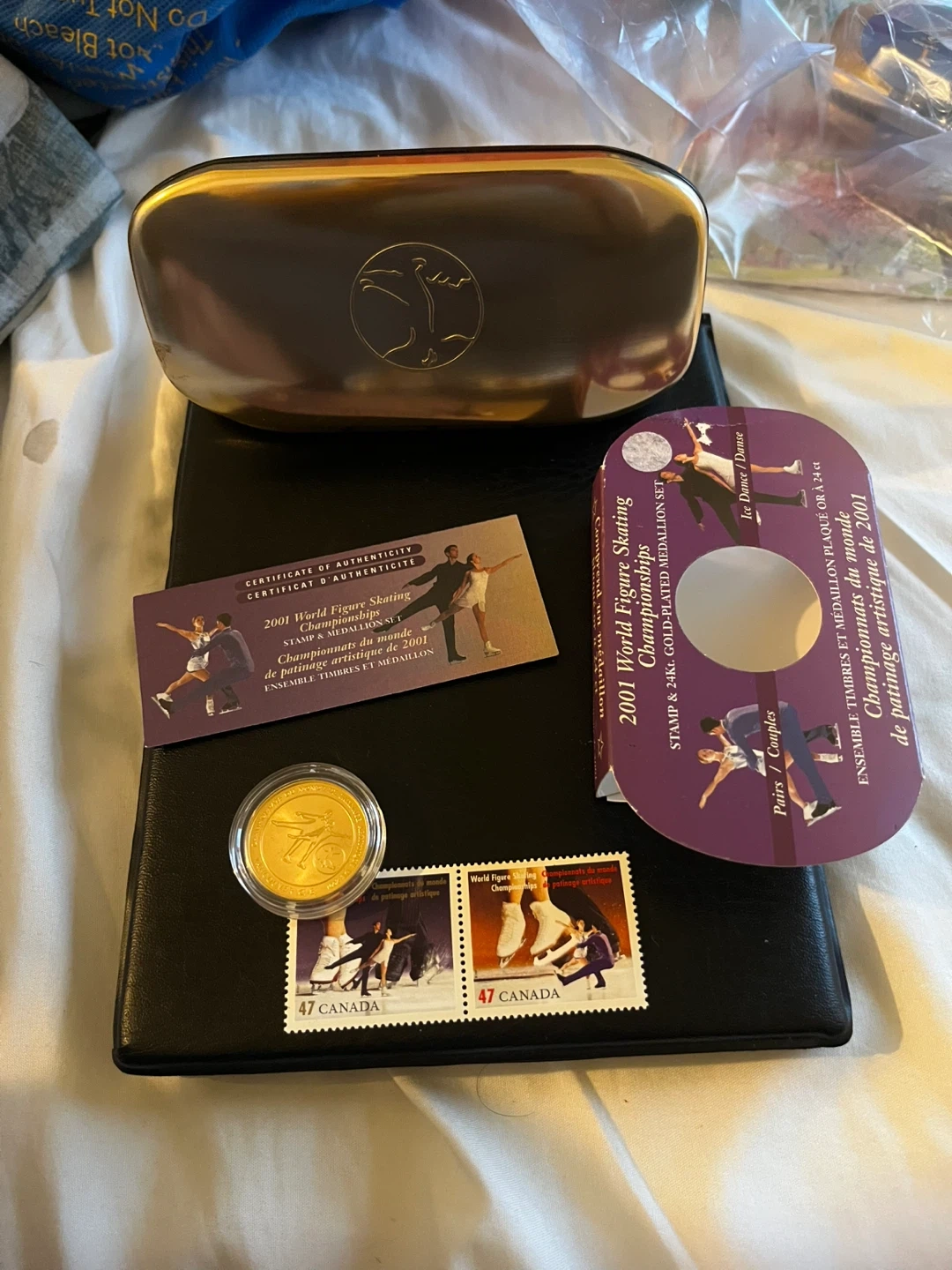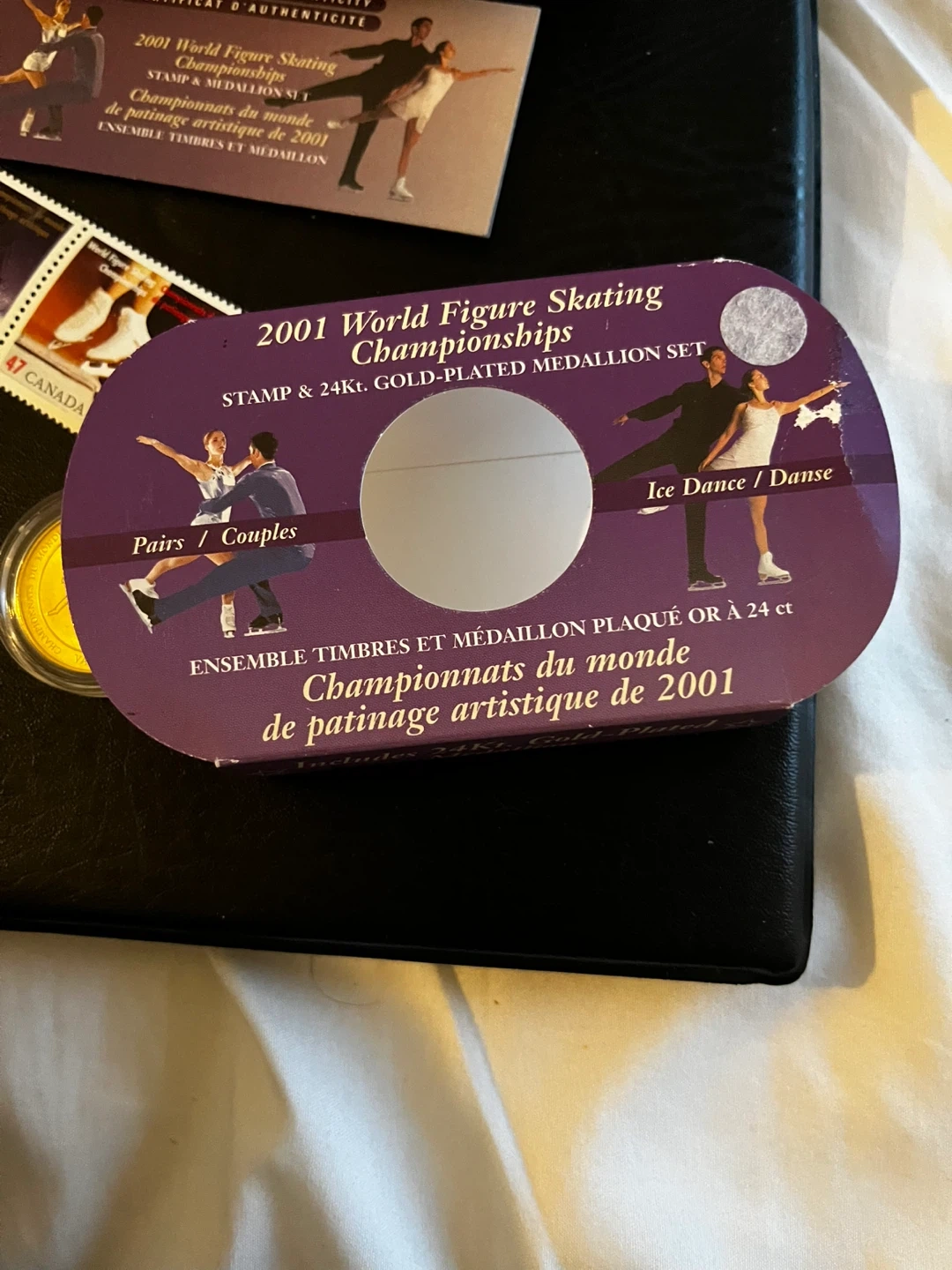 This set includes a 24kt gold-plated medallion and two commemorative stamps from the 2001 World Figure Skating Championships. It comes in a protective case with a certificate of authenticity. The set features images of pairs and ice dance skaters.