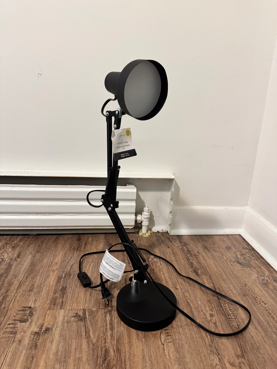 Black metal desk lamp. Adjustable arm and shade. Includes on/off switch. E27 bulb mount.