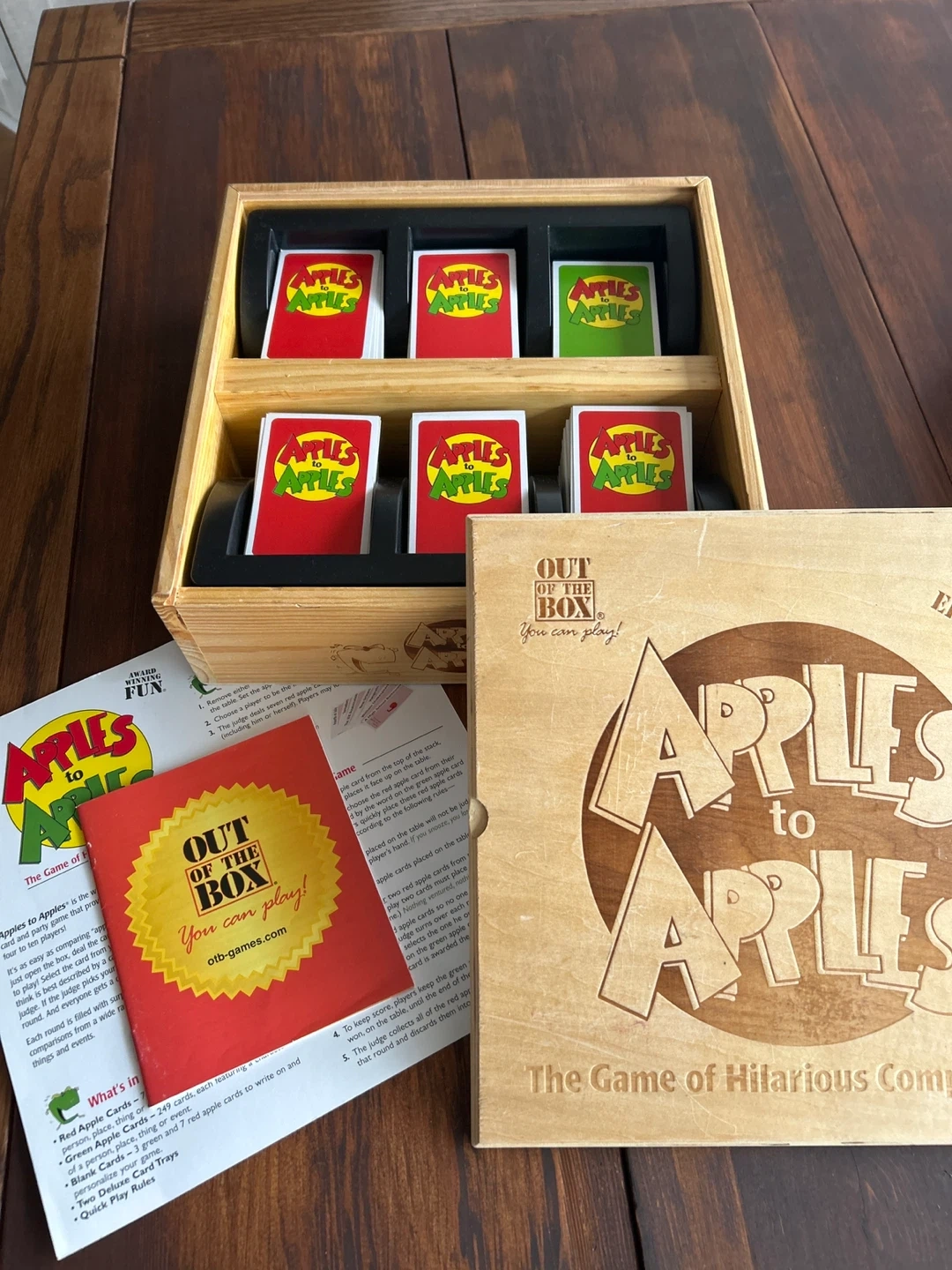 This is the Apples to Apples Apple Crate Edition board game. It's the game of hilarious comparisons. Includes 249 Apple Cards and 49 Red Cards.