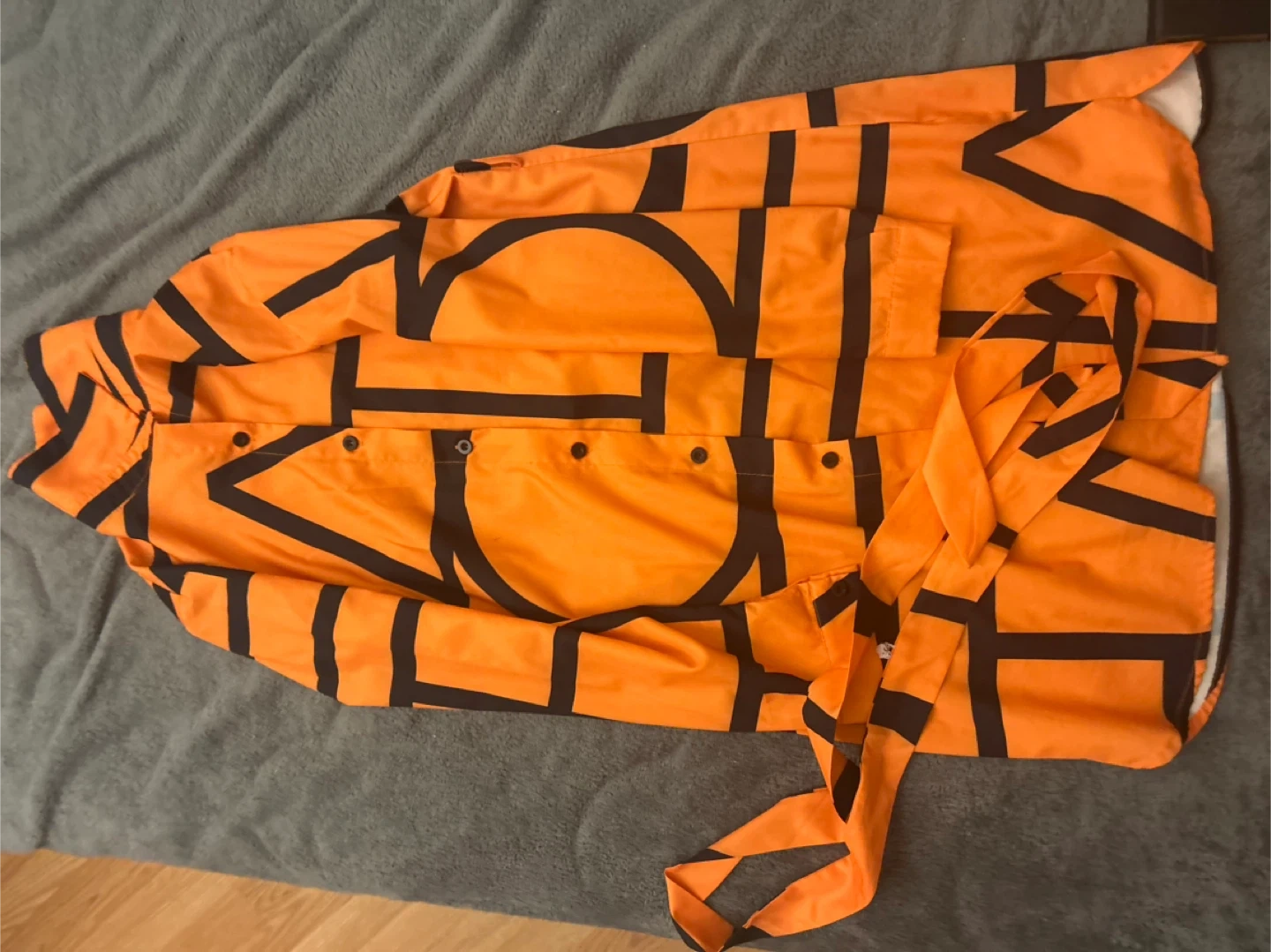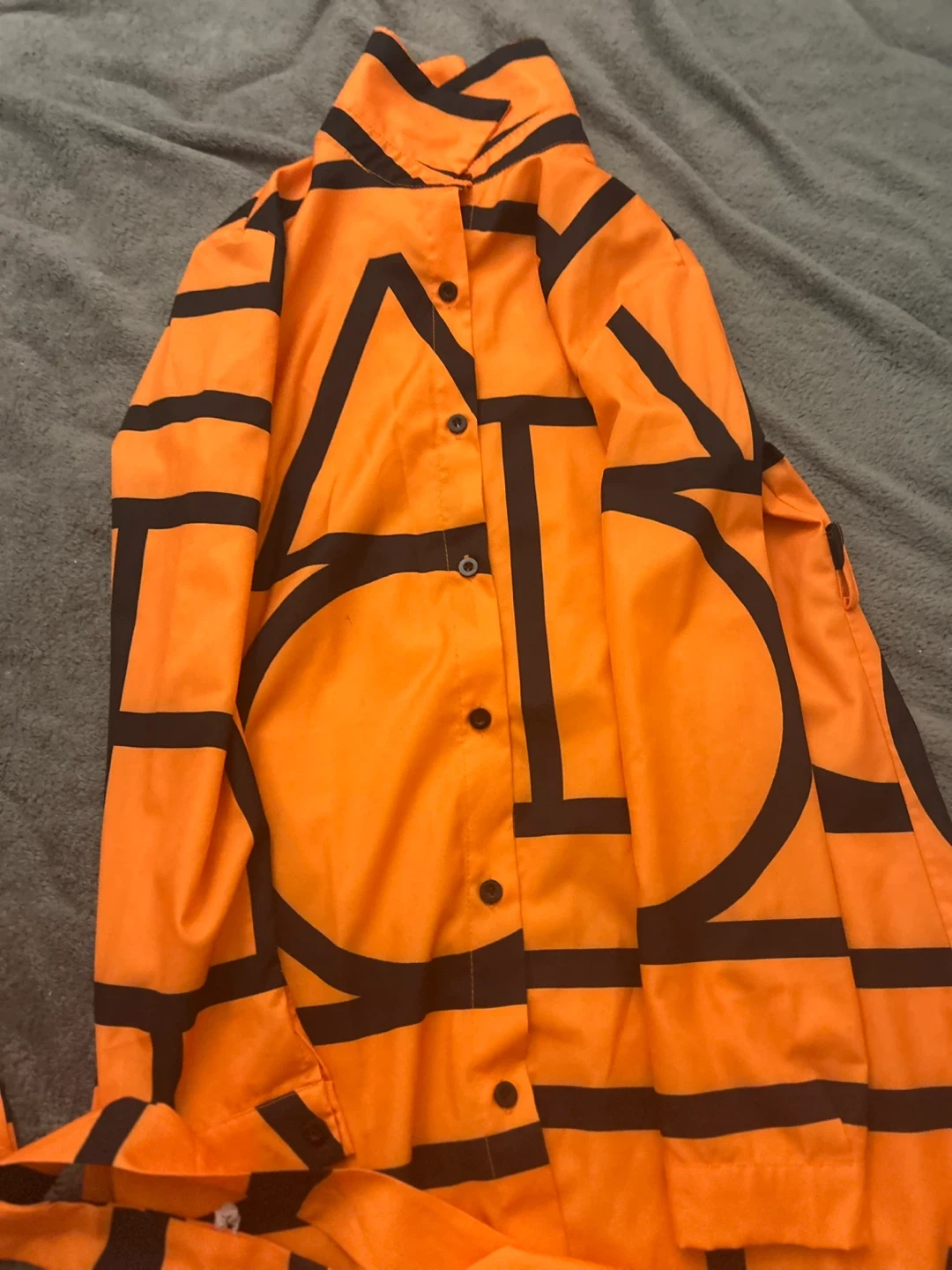 This is an orange button-up shirt featuring a bold black geometric design. It has a classic collar and button closure down the front. The material appears to be a lightweight synthetic blend, perfect for warmer weather. This shirt is great for making a statement!