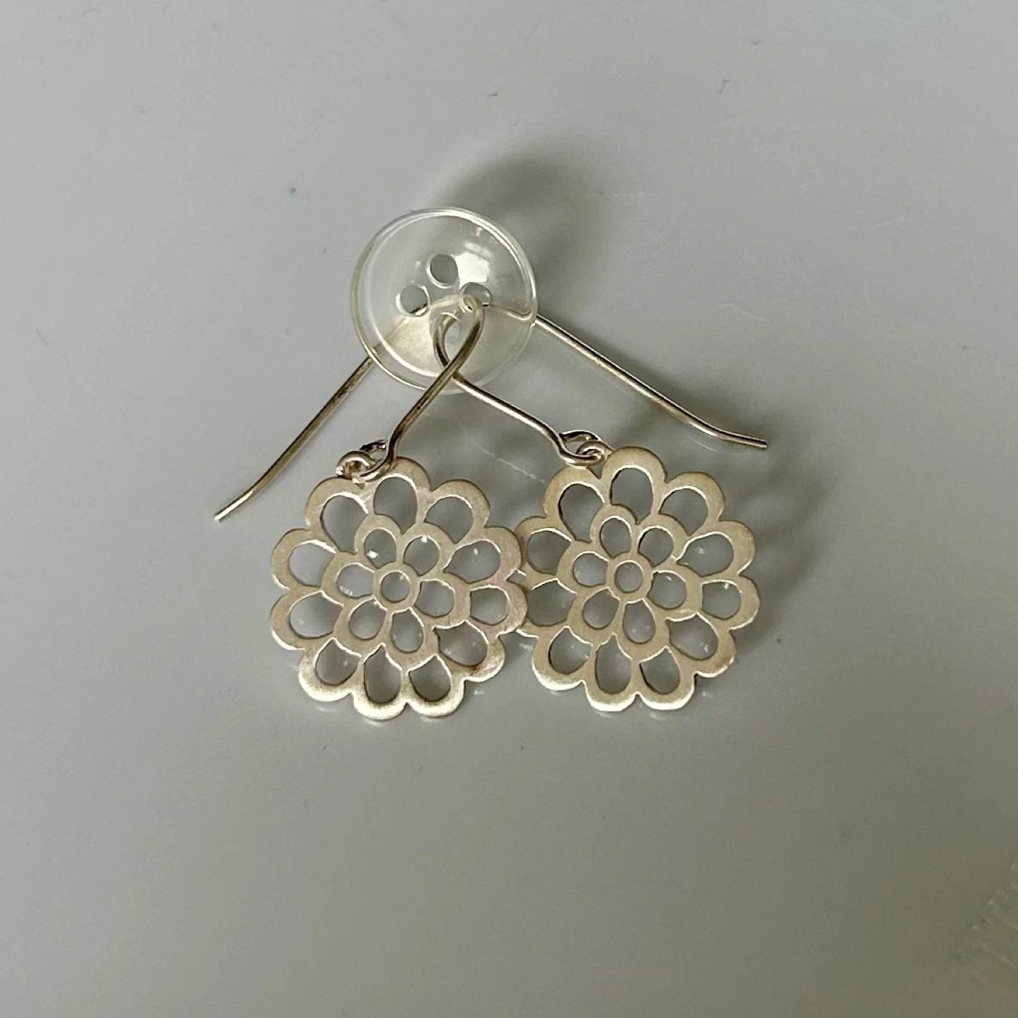 Cute floral cut-out dangle earrings! They're made of a silver. The earrings have a drop design. Polished and ready!