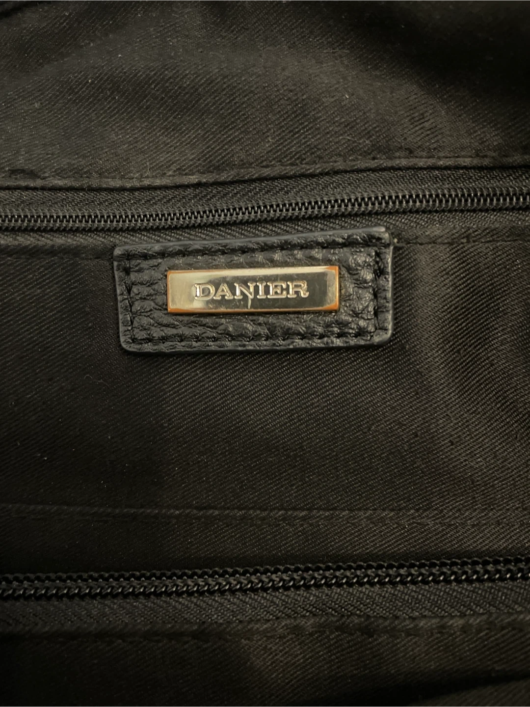 This is a Danier black leather handbag. It features a zippered main compartment and interior pockets. The leather material is durable. 12x17 inches.