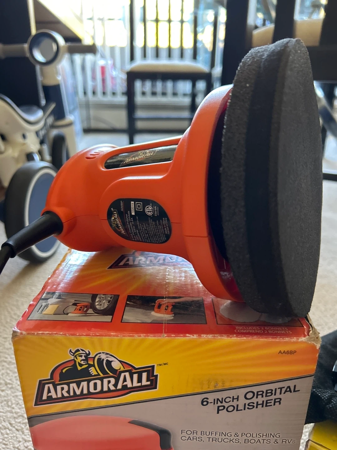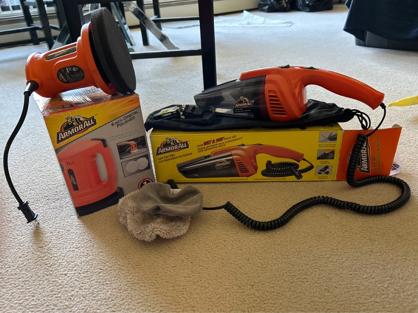 This listing includes an Armor All 6-inch orbital polisher with a buffing pad and an Armor All 12V car wet/dry vacuum. The vacuum comes with a carrying bag and accessories. Both items are orange and black.