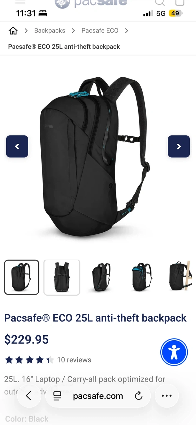 Pacsafe ECO 25L anti-theft backpack in black. Very lightly used (got last month, it is a bit too tall / thin for me) and I somehow misplaced one of the waist straps, hence the lower price.