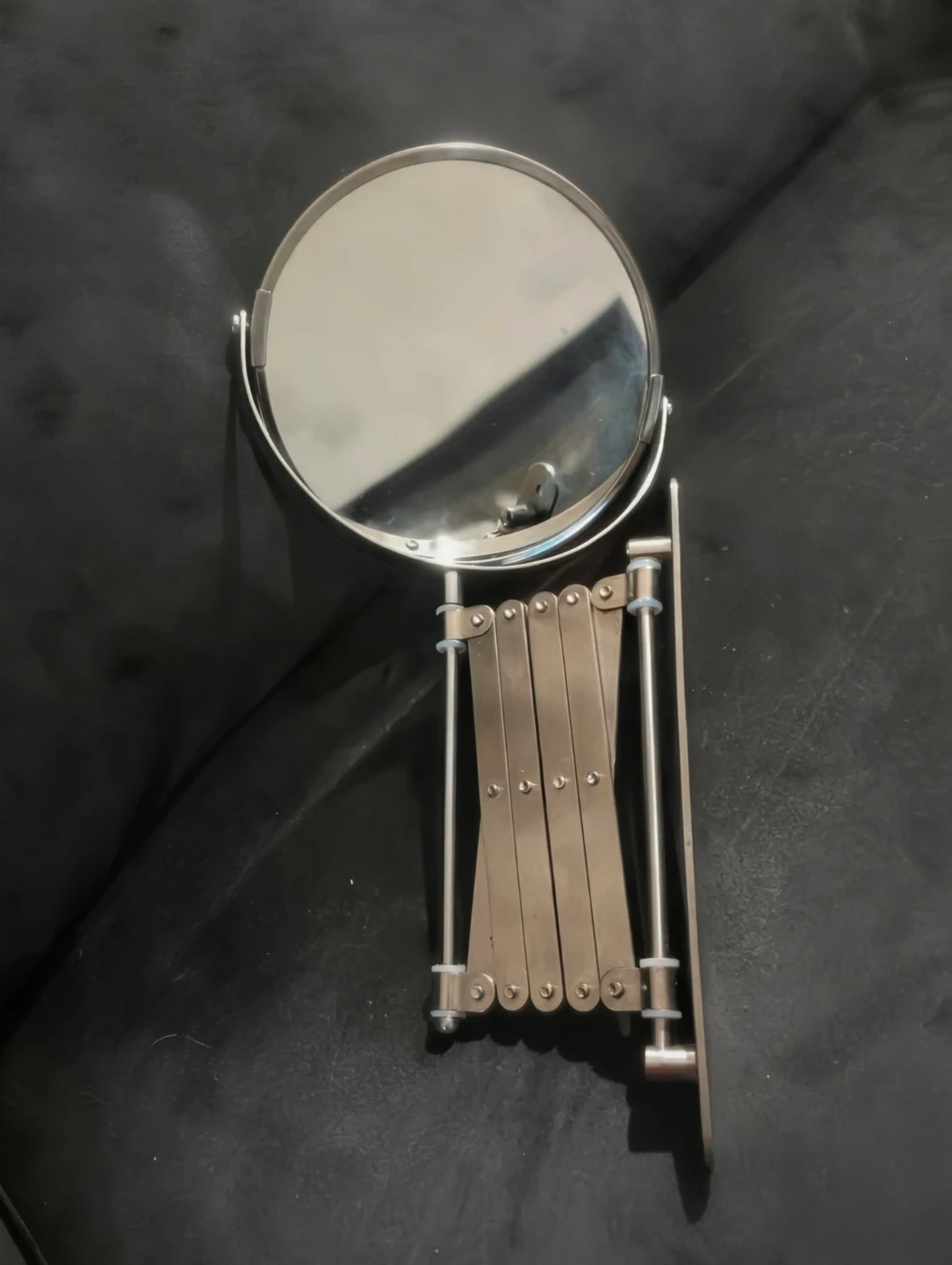 This is a wall-mounted mirror with an extendable arm. It's made of metal and features a round mirror head. The arm allows for adjustable positioning. This mirror is useful for applying makeup or shaving.