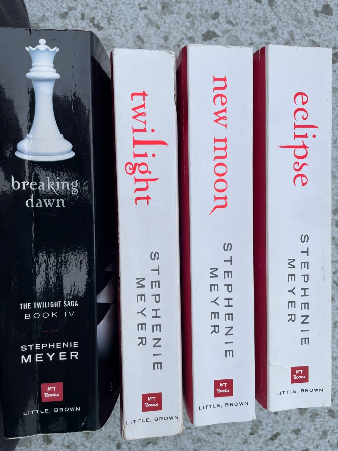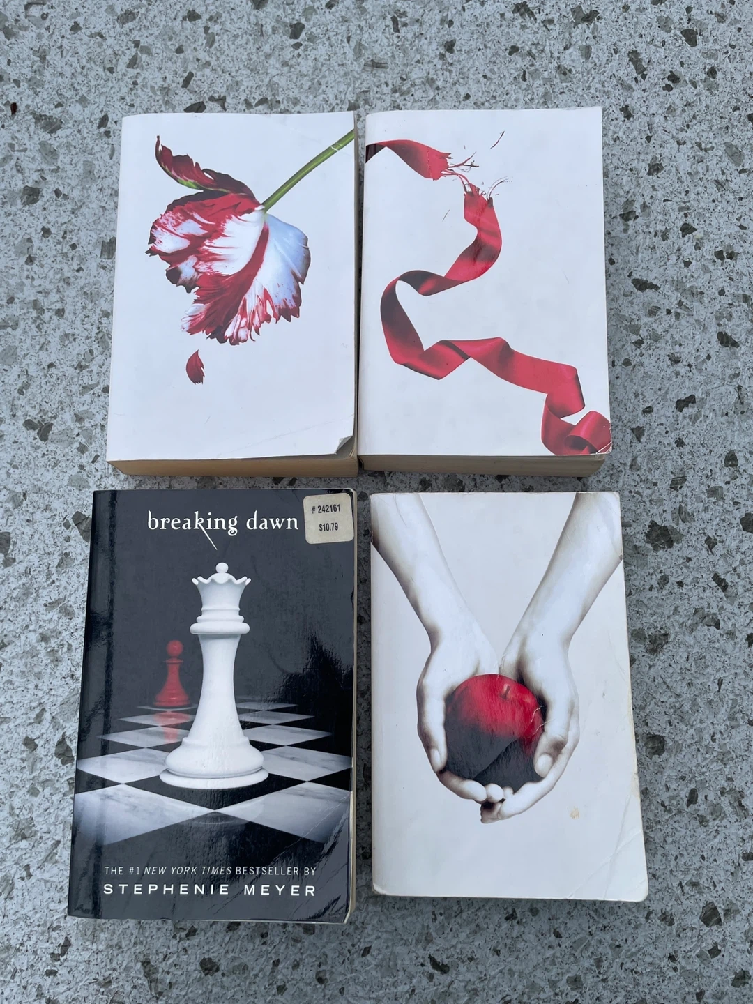 Four paperback books from The Twilight Saga series. Includes Breaking Dawn, Twilight, New Moon, and Eclipse. Written by Stephenie Meyer. These are the first four books in the popular series.