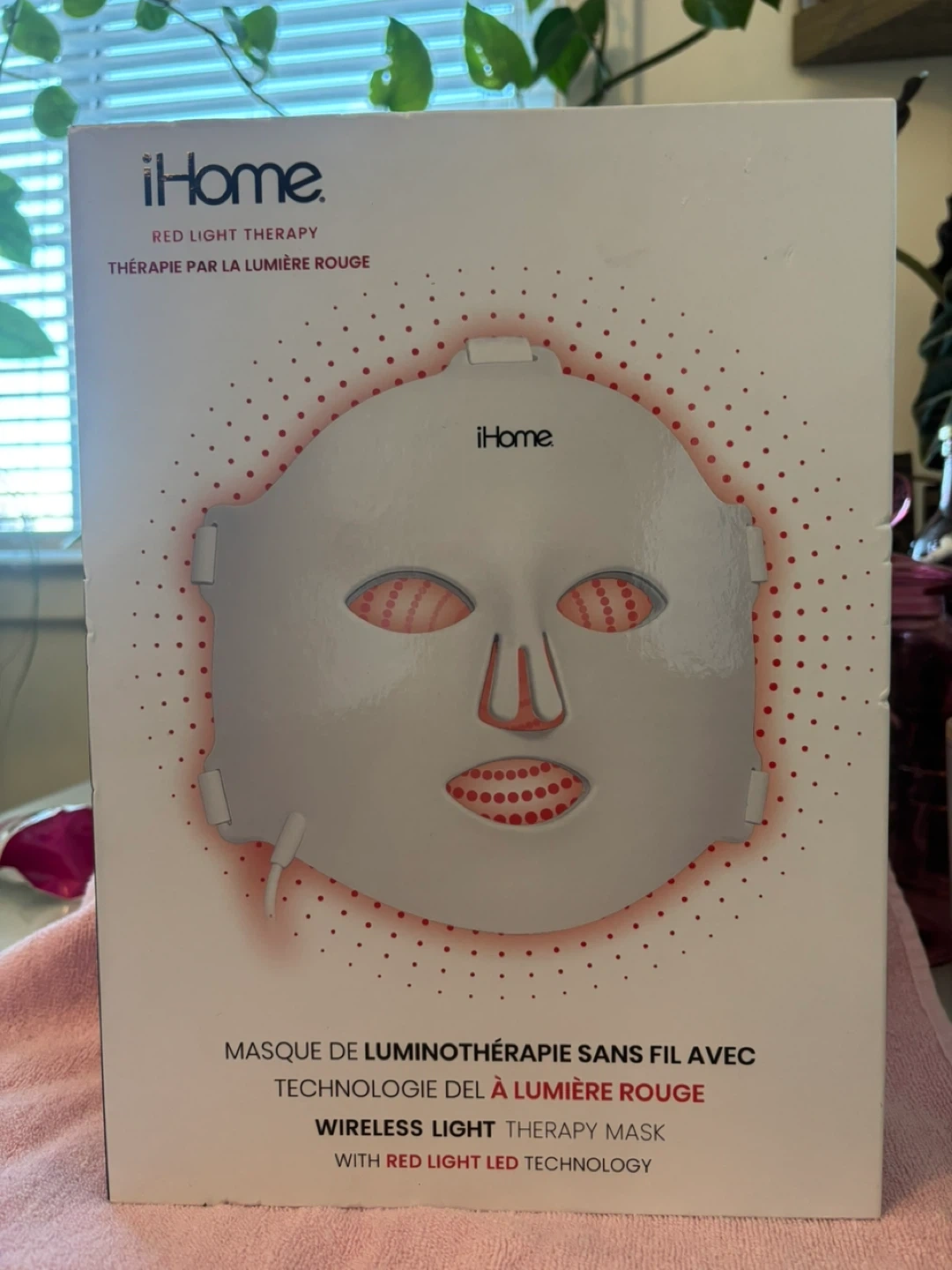 This iHome wireless light therapy mask uses red light LED technology.