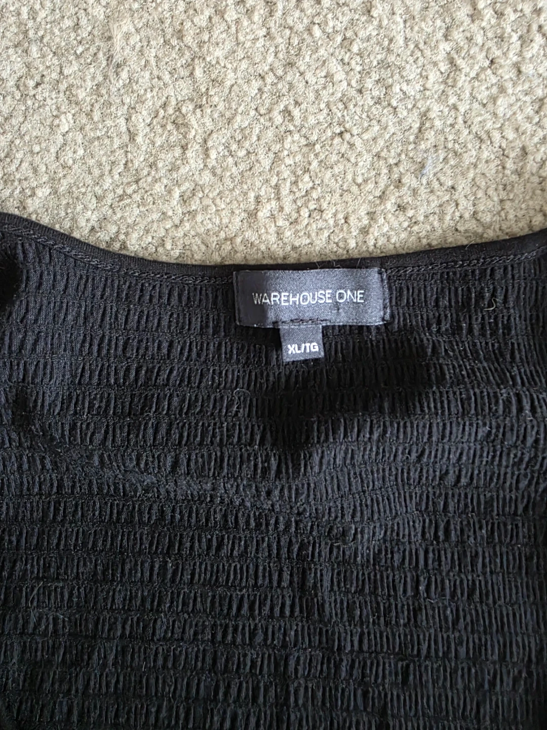 Black tank top from Warehouse One. It's a size XL/TG. The material is smocked with a textured pattern. This top is sleeveless with a square neckline.