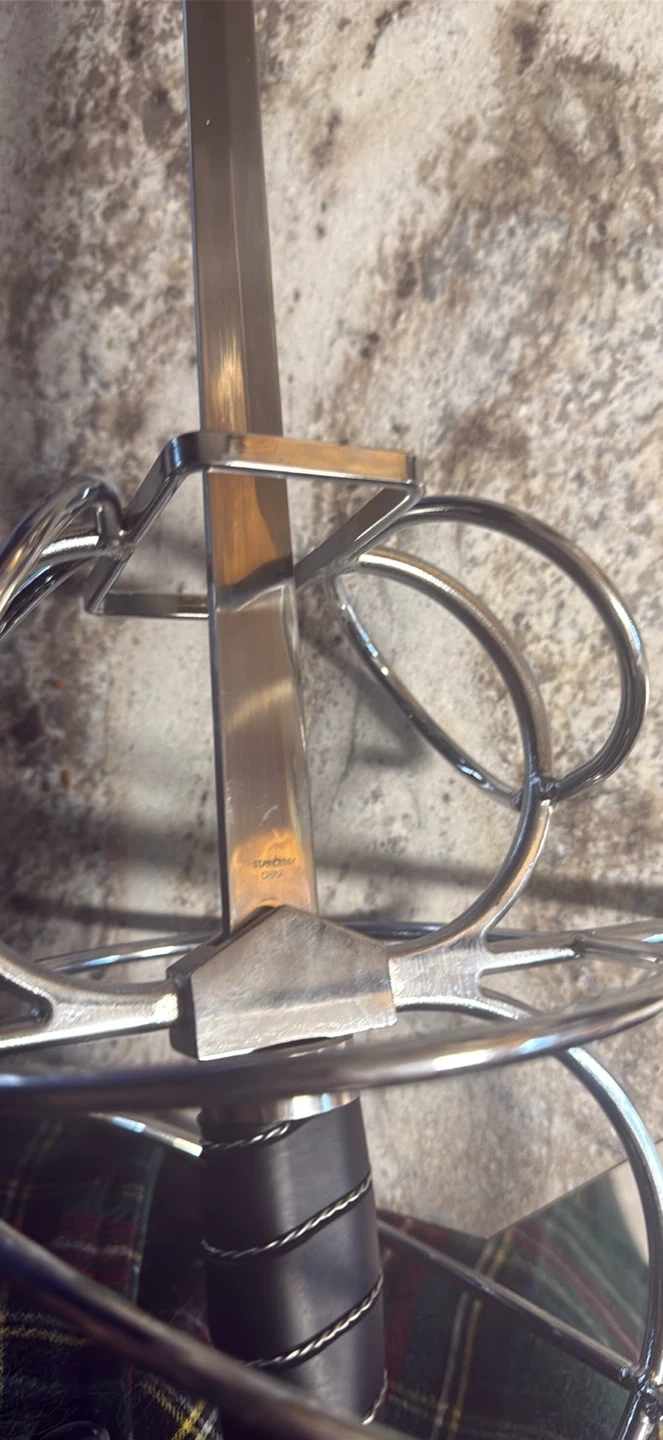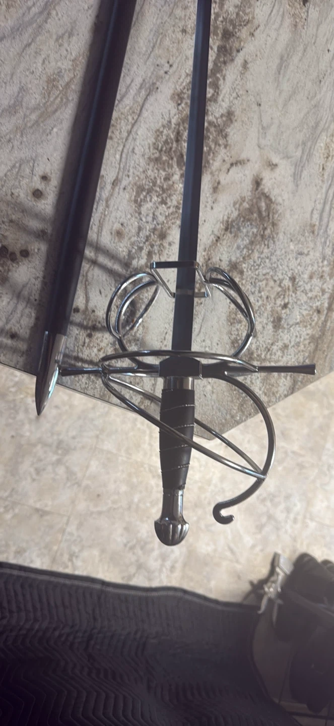 This decorative rapier features a steel blade and a complex hilt. It comes with a matching scabbard for protection. A beautiful piece for display!