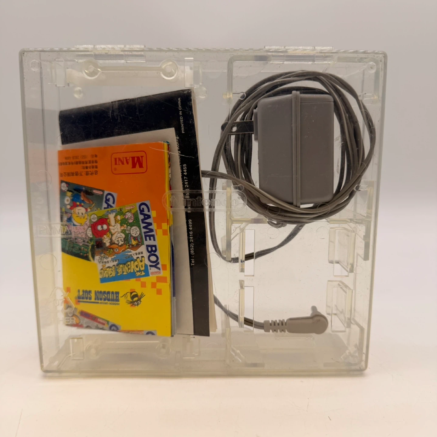 Original Nintendo Game Boy accessory bundle including hard case, power adapter, manuals, and inserts.