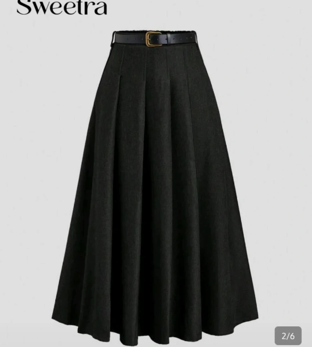 Sweetra black pleated maxi skirt with a matching belt. It's made from woven fabric. Elastic waistband for a comfy fit. This skirt is suitable for casual wear.