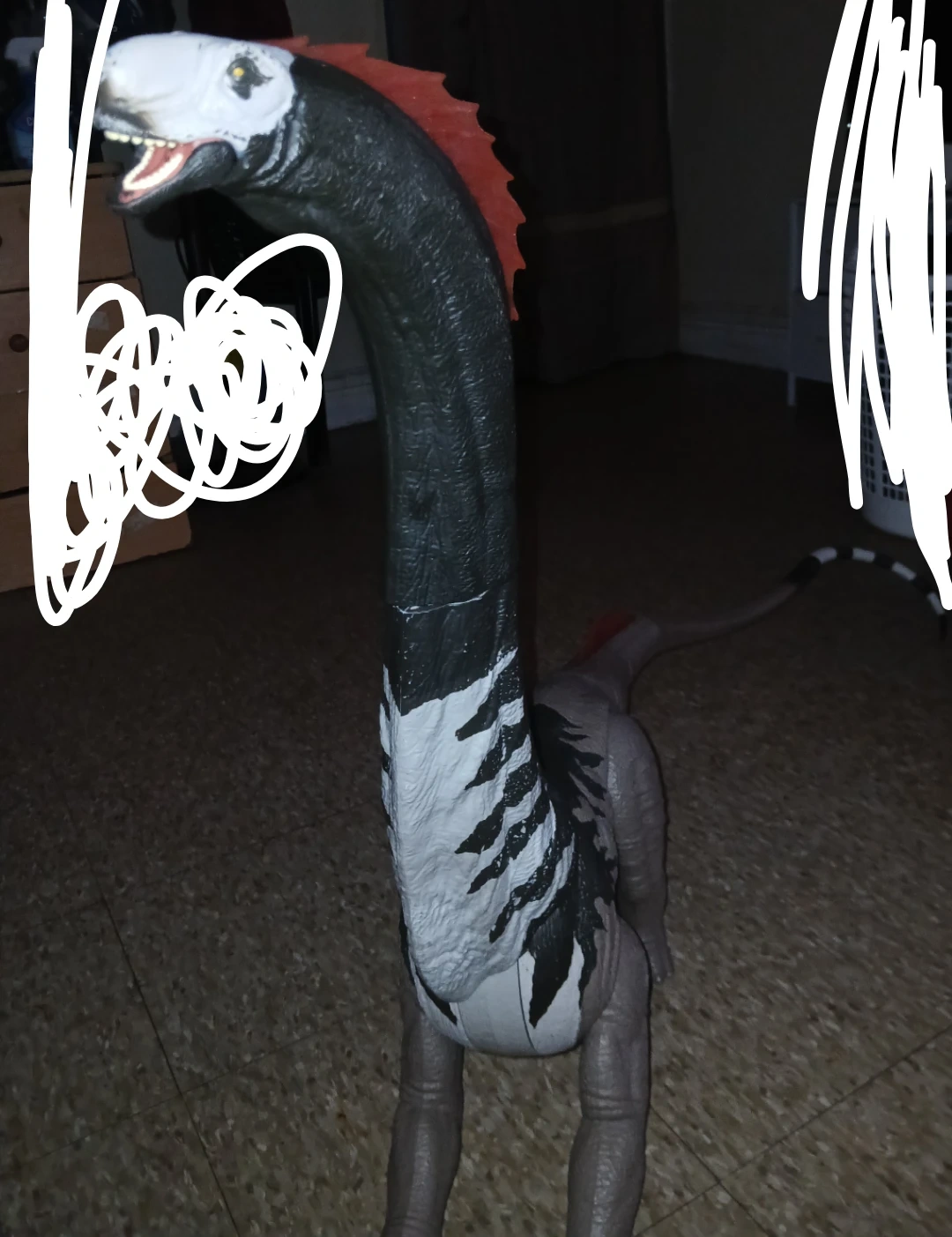 This is a large Jurassic World Brachiosaurus dinosaur toy. It's made of plastic and has a movable neck and tail. The coloring is grey with black and white accents and orange frills.