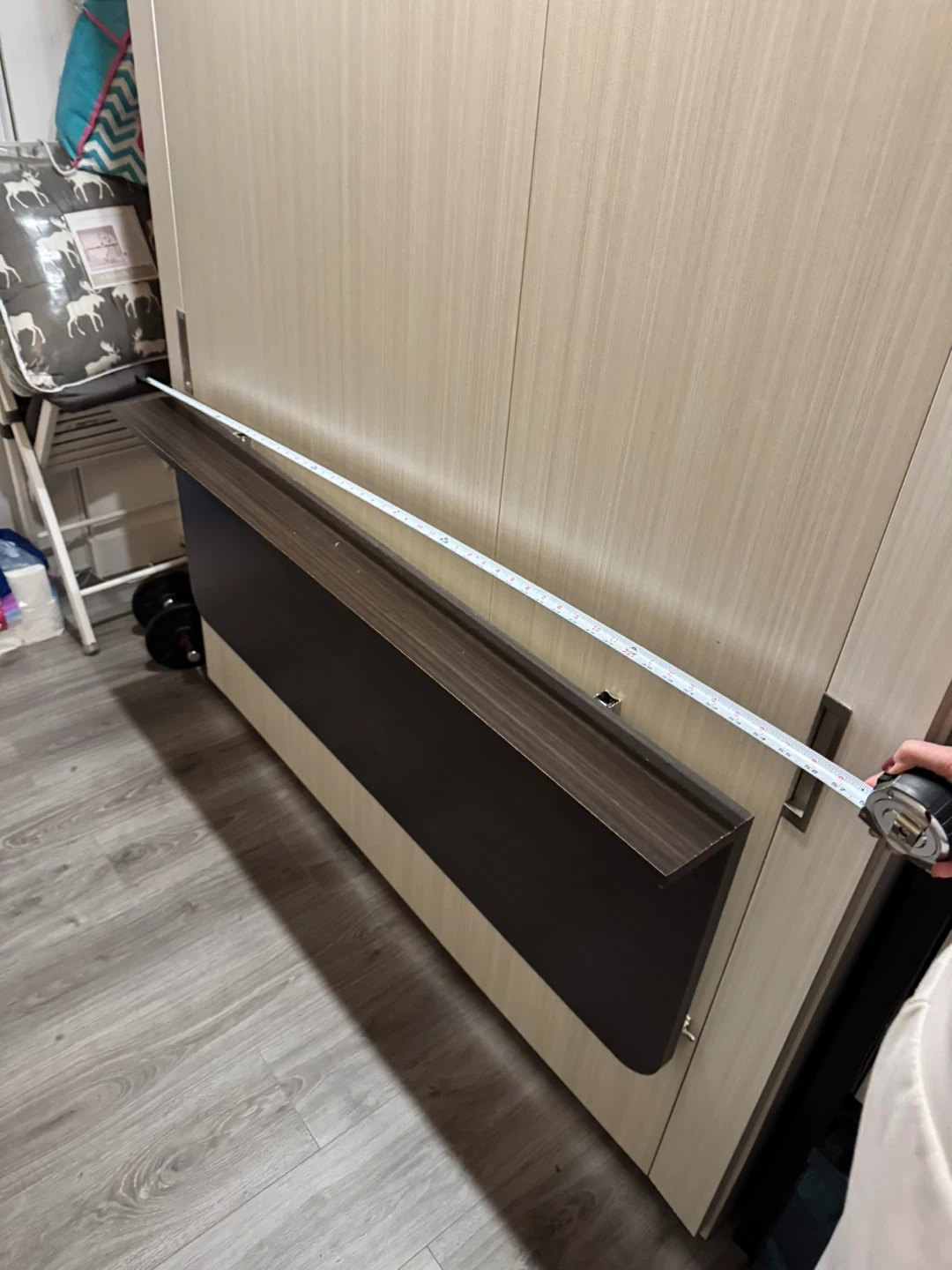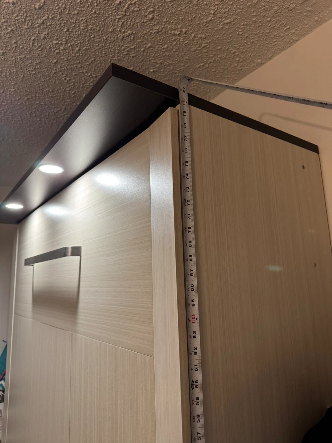 This murphy bed folds up to reveal a desk surface and has built-in LED lighting. It's a great space-saving solution for small rooms. The main cabinet is approximately 81 inches tall and 58.5 inches wide.