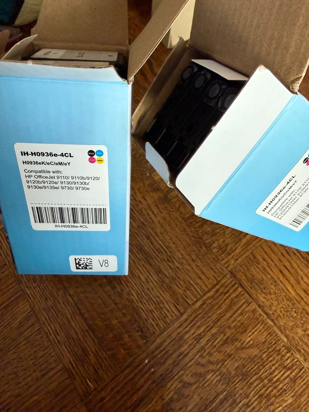 These are replacement ink cartridges for HP OfficeJet printers. The set includes black, cyan, magenta, and yellow cartridges. They're compatible with various HP OfficeJet models including 9110, 9110b, 9120, 9120b, 9130, 9130b, 9135e, 9730, and 9730e. Print quality is important for your documents!