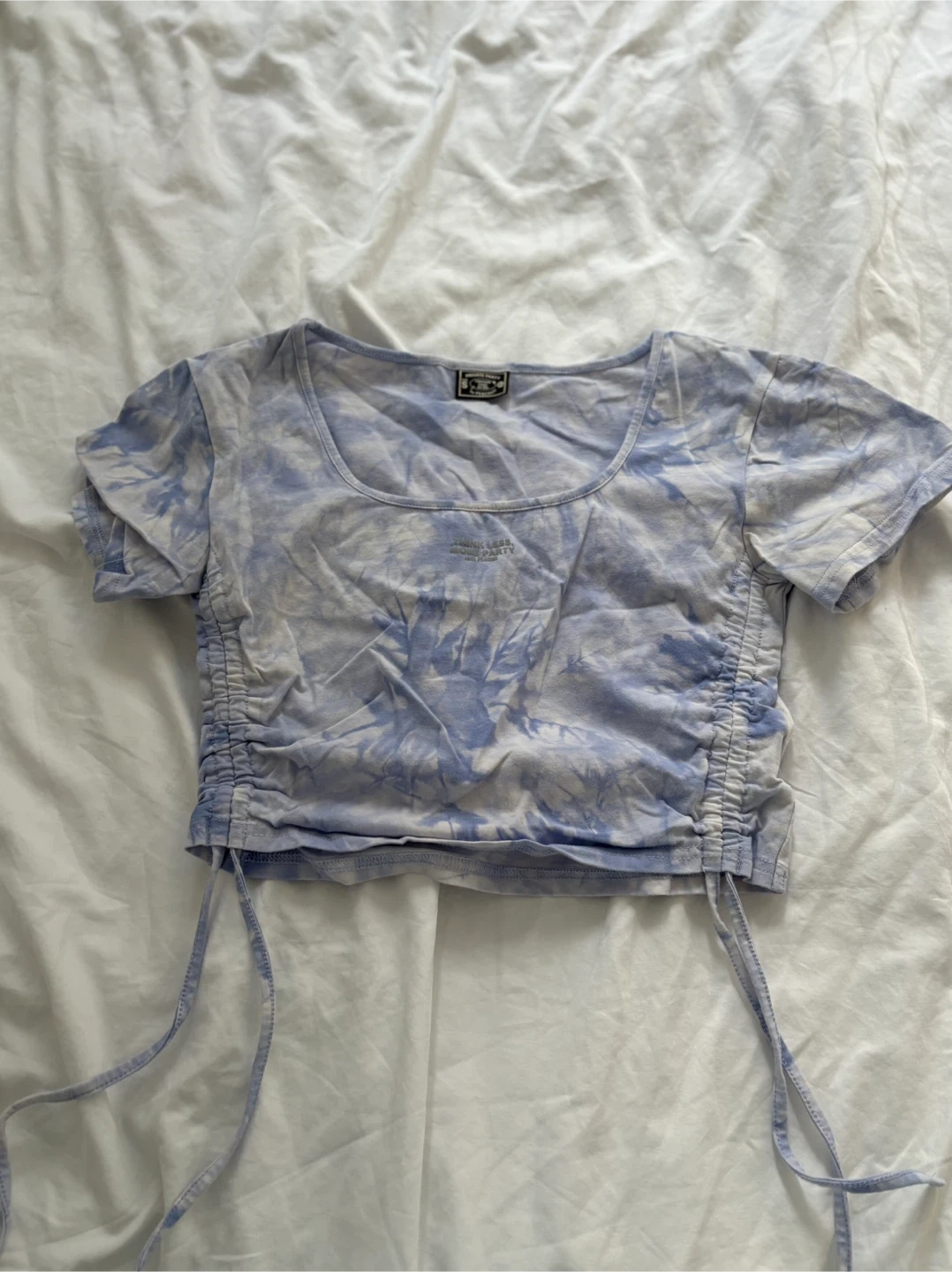 Cute ruched tie-dye crop top with adjustable side drawstrings. It's made of a soft, stretchy material. This top is perfect for warmer weather!