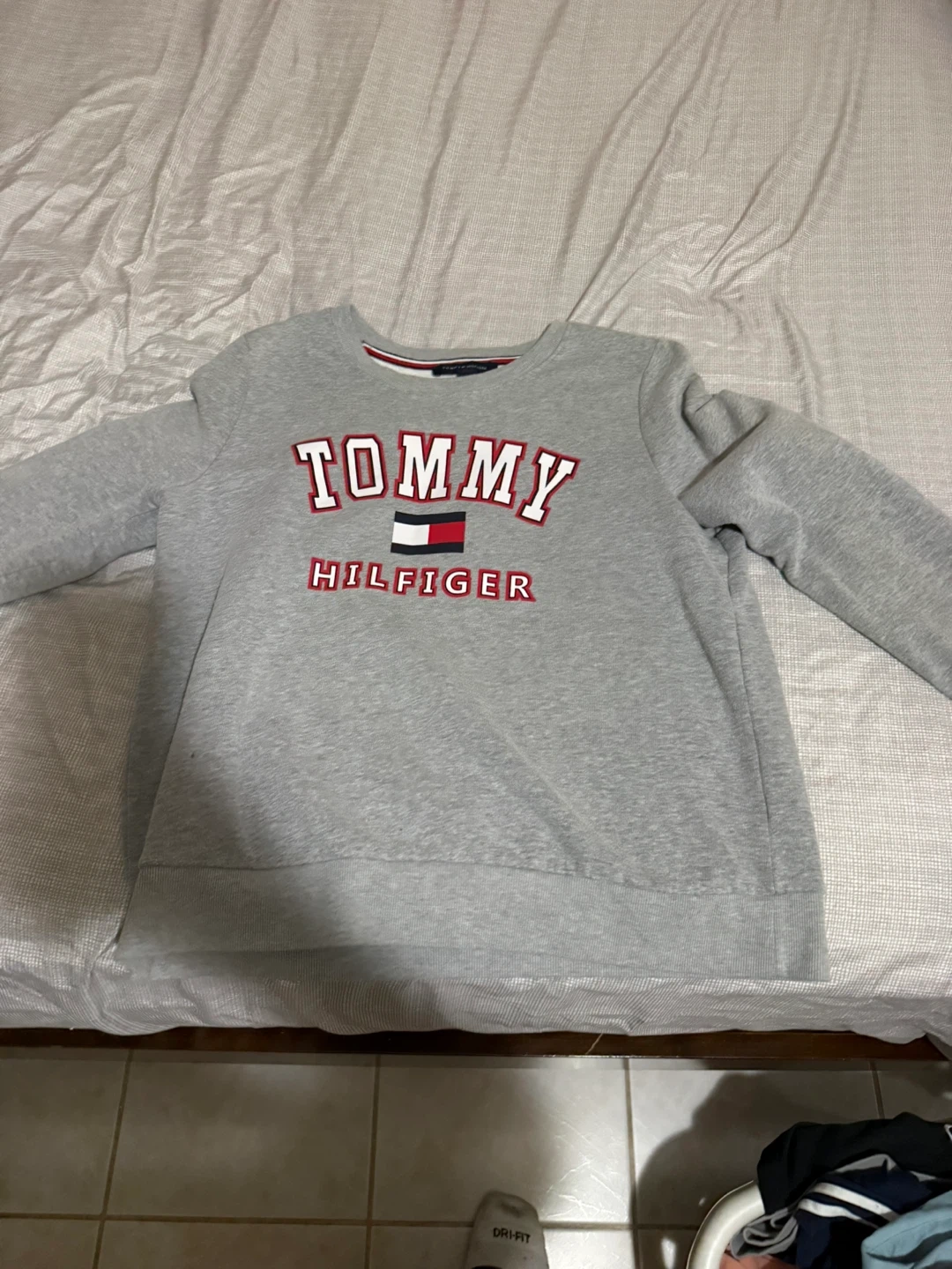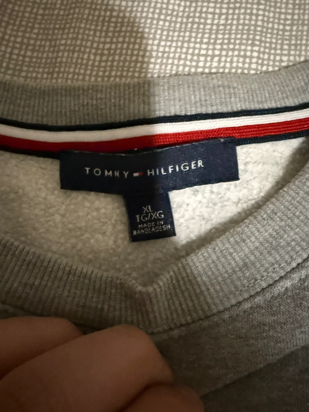 Grey Tommy Hilfiger crewneck sweatshirt. Size XL, made in Bangladesh. It's a comfortable pullover style. A good choice for casual wear!
