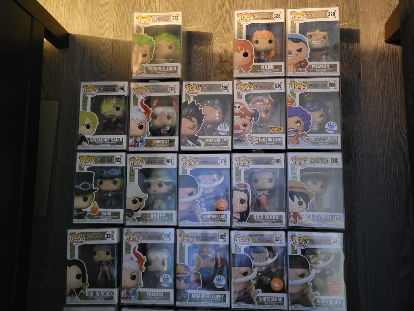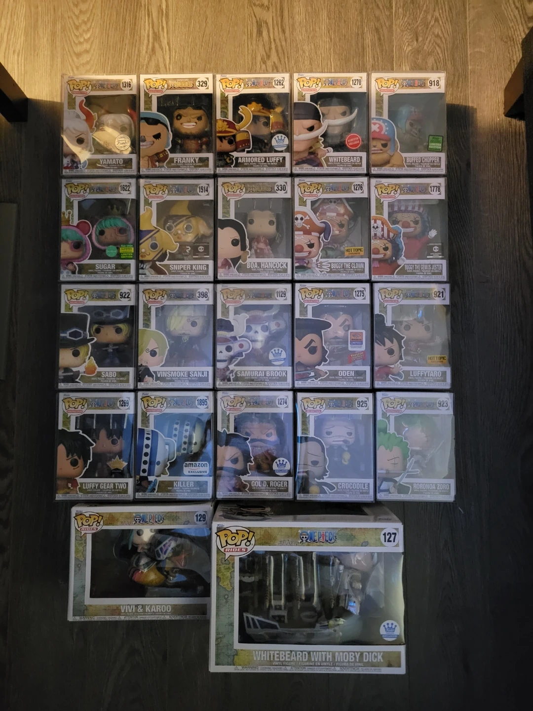 Awesome collection of Funko Pop! vinyl figures from the popular anime series One Piece. These collectible figures are in their original boxes and showcase various iconic characters. Perfect for any One Piece fan's display!