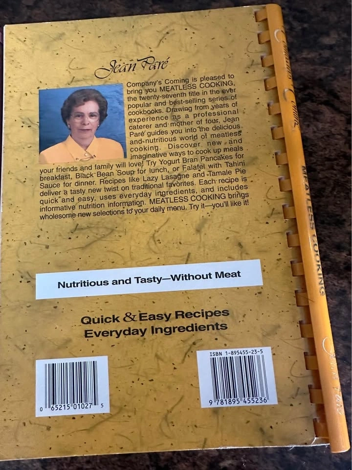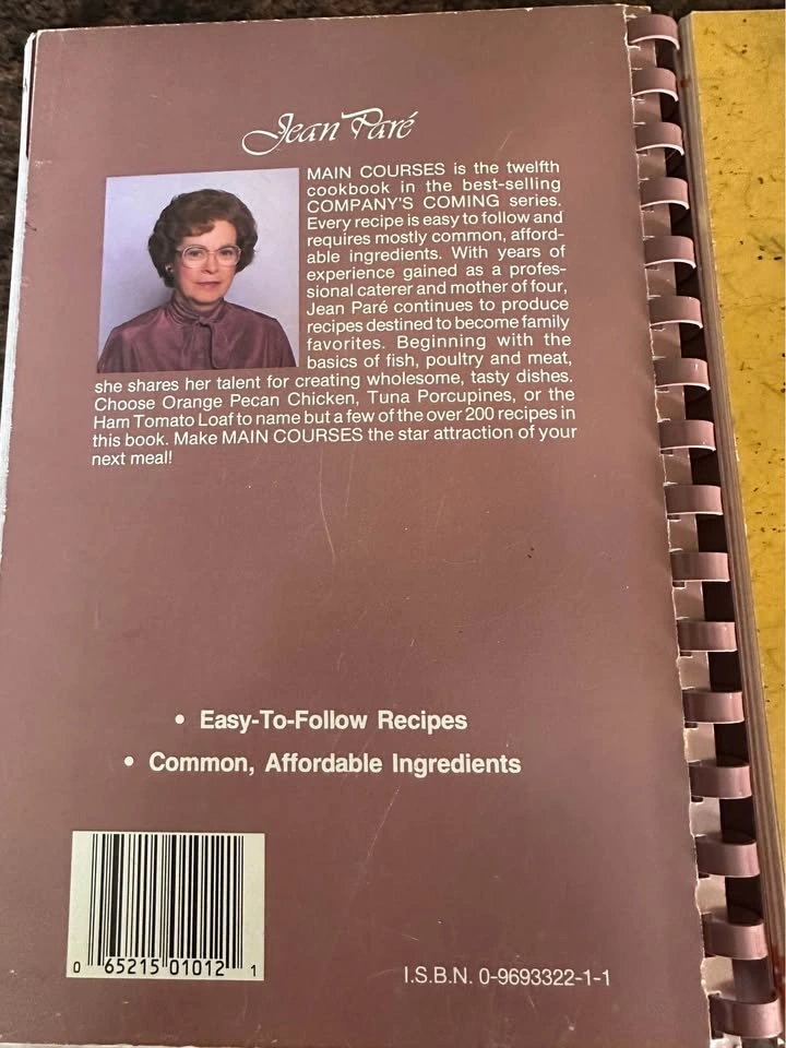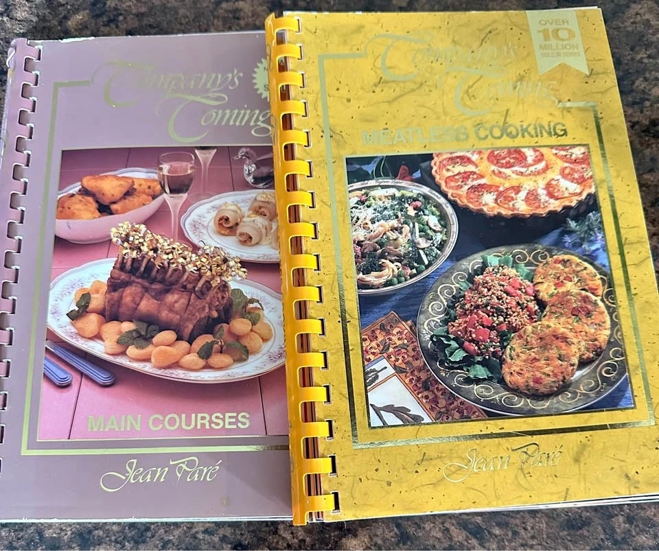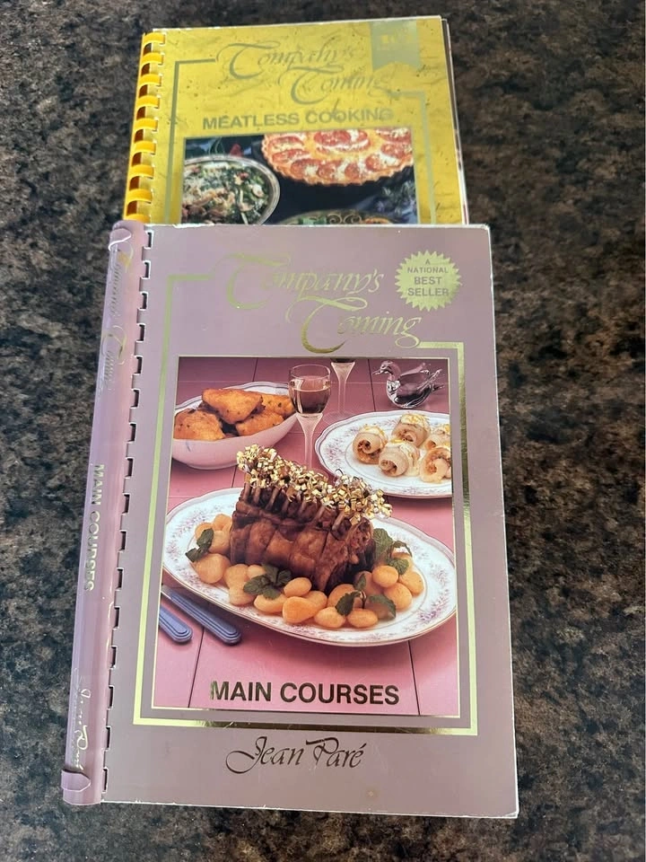 Company's Coming series by Jean Paré. Includes 'Meatless Cooking' (1997, yellow cover) with vegetarian recipes, and 'Main Courses' (c. 1994, pink cover) with various protein dishes and sides. Great collector's items or for everyday cooking. Both are in excellent condition for their age, with no tears, stains, or missing pages. See photos for details. $8.00 for both. Pick up in Welland.