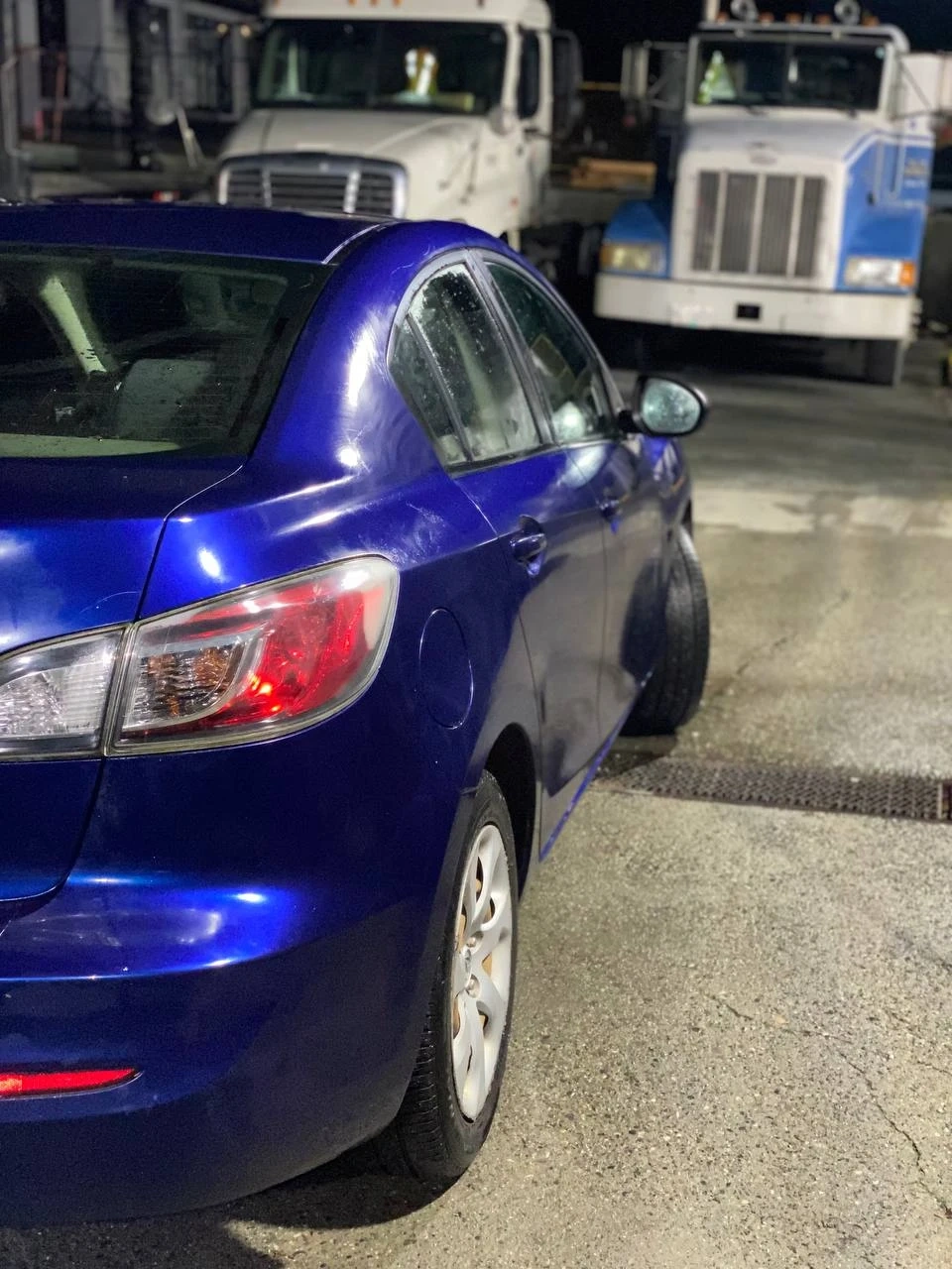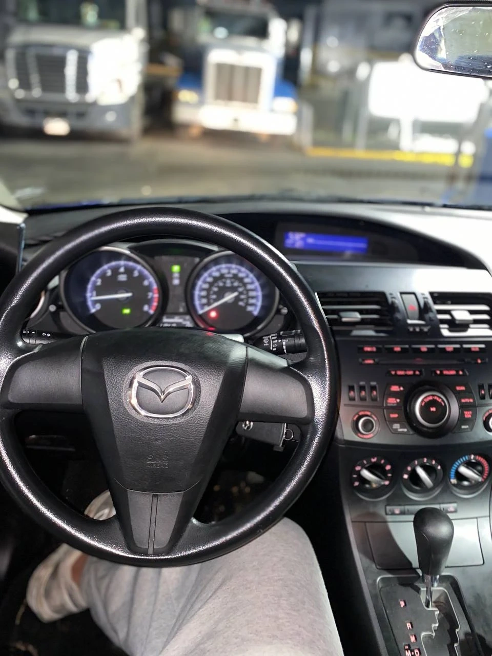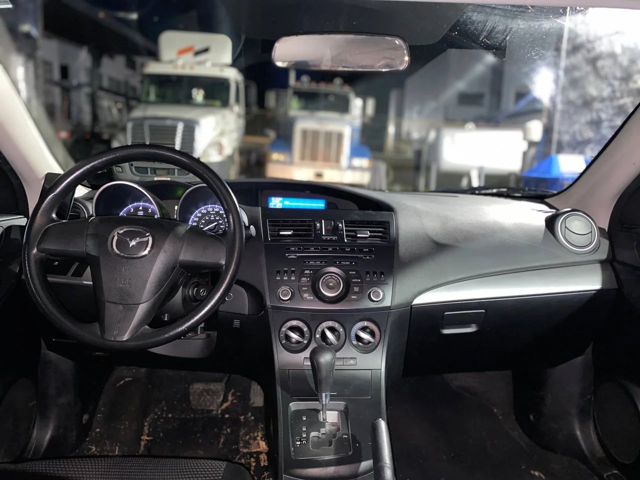 Blue four-door Mazda3 sedan. Automatic transmission. Interior features a clean dashboard and gauges.