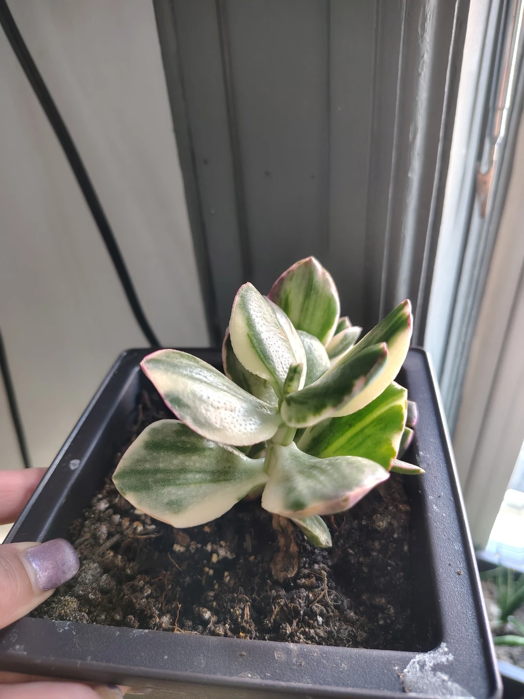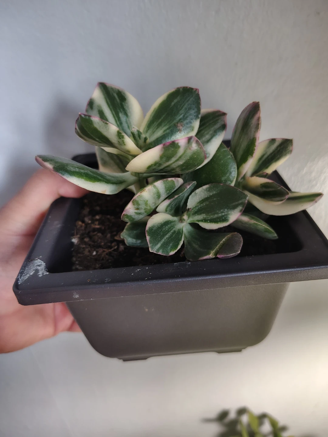 This variegated jade plant features striking green and white leaves with pinkish edges. It's potted in a dark square planter. A lovely addition for any plant enthusiast!