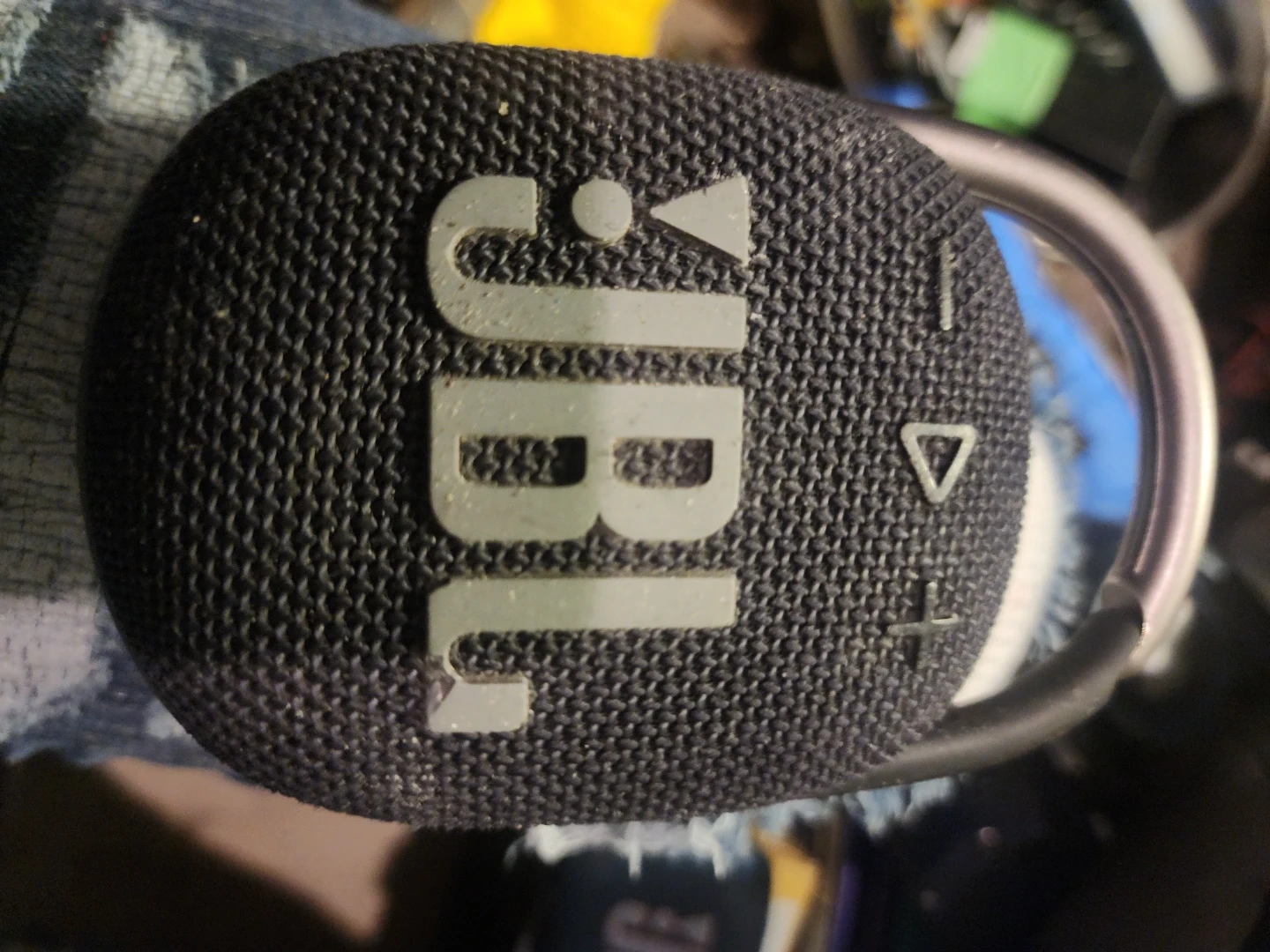 This is a JBL Clip 3 portable Bluetooth speaker. It's black with a fabric exterior and a built-in carabiner clip for easy attachment. It's great for taking music on the go! My name is Jamie and my phone number is 2508637893