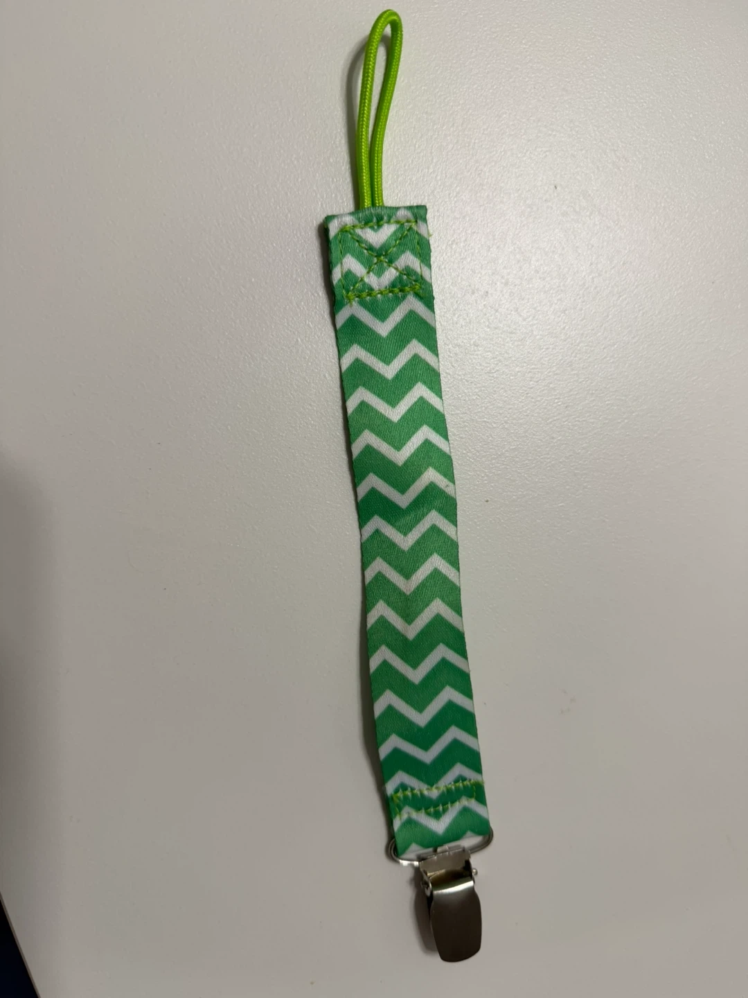 This is a green fabric pacifier clip with a white chevron pattern. It has a metal clip on one end and a loop on the other. It's great for keeping pacifiers or small toys from falling on the floor.