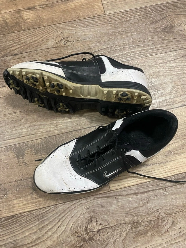 Step up your golf game with these used Nike golf shoes, designed for comfort and performance on the green. These shoes feature a classic black and white design and provide excellent traction. Brand: Nike, Style: Golf Shoes, Colour: Black and White. Priced to sell at $15, these golf shoes are a steal compared to new ones! If the ad is up, they're still available. Size 11. Located in Cochrane. Cash accepted.