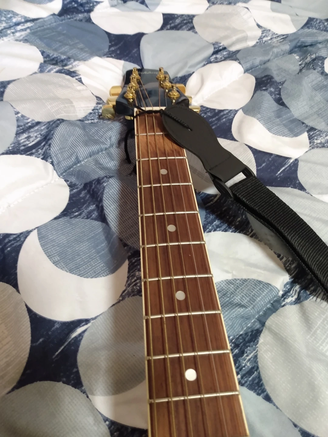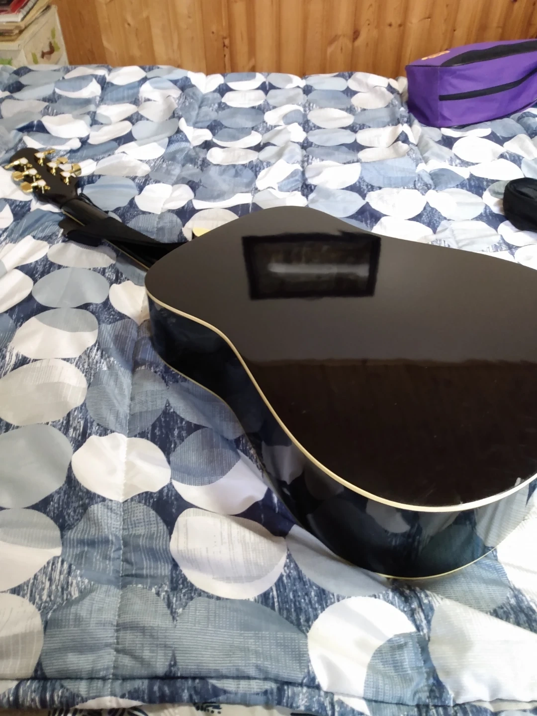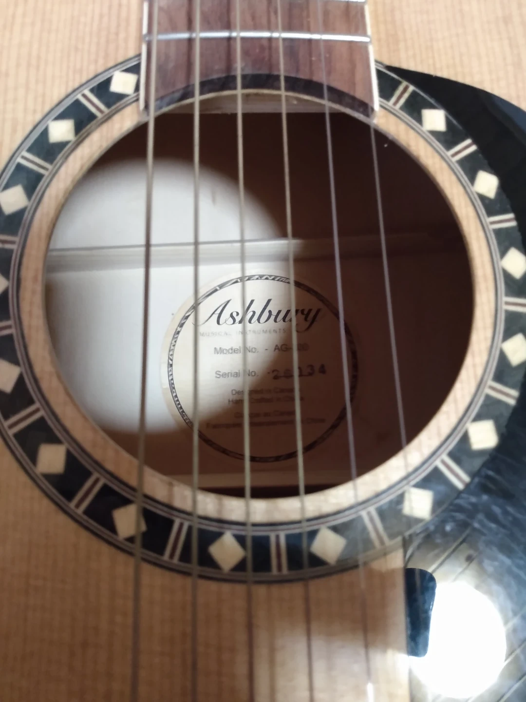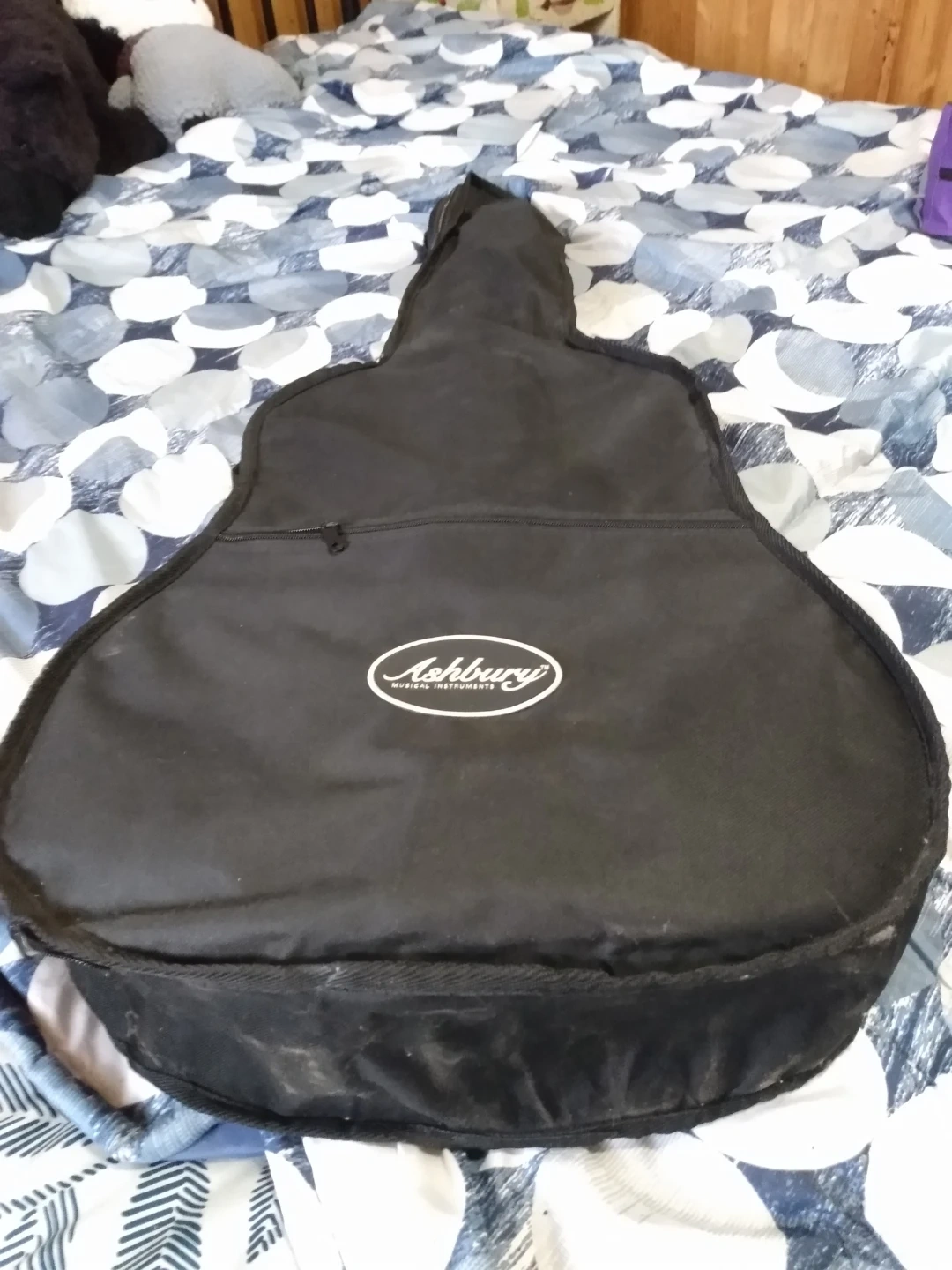 This is an Ashbury AG-08 acoustic guitar. It features a light wood top and a black gloss finish on the back and sides. Includes a black gig bag for protection. Great for learning or casual playing!