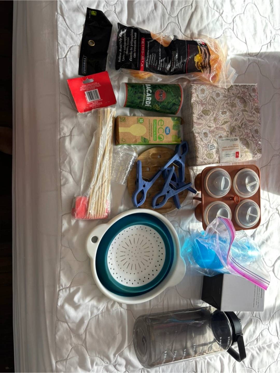 Camping supplies comes with wooden spoons 30 of them poly rope, and other assorted kitchen supplies like egg procher , collapsible collander , plastic cups 10 of them , measuring cup , pop up lantern salt dispenser, Also includes a package of 40 decorative paper napkins with a floral design . smoke free pet free home . . Pick up at 551 Emerson street . Coquitlam . Cash only . No delivery