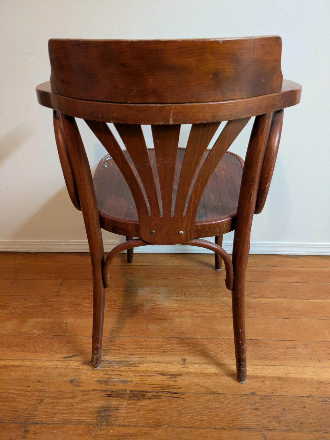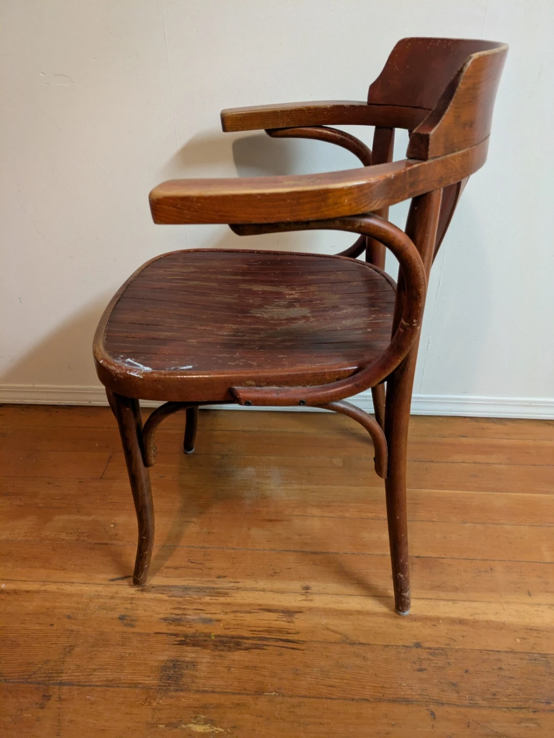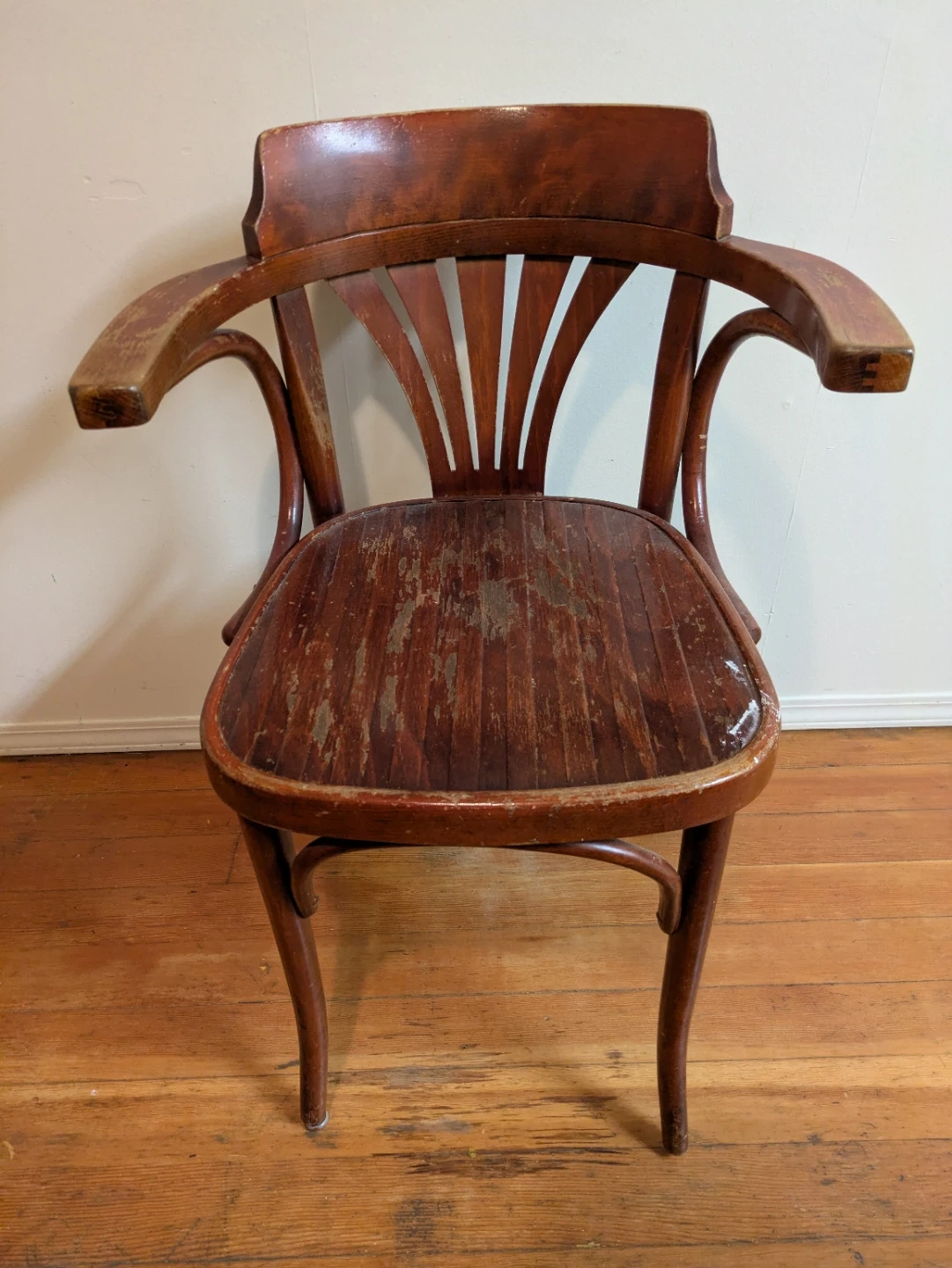 This is a classic vintage wooden armchair with a bentwood design. It has a rich brown finish and curved arms. Some wear is visible on the seat, adding to its vintage charm. Great for refurbishing and or resale.