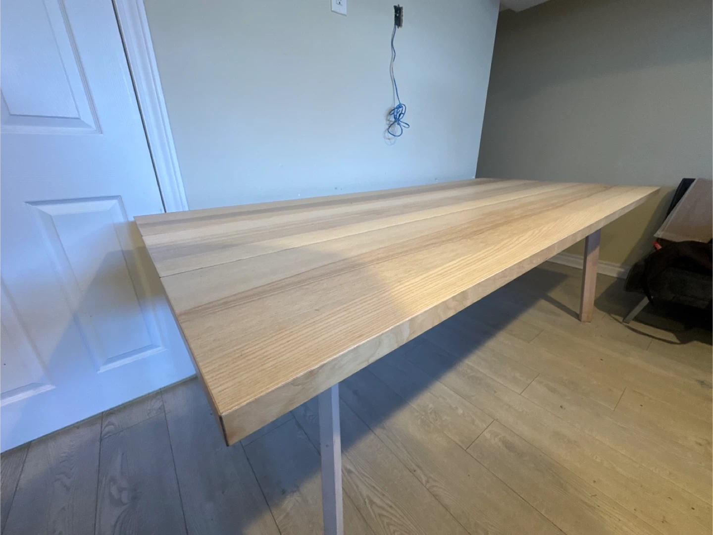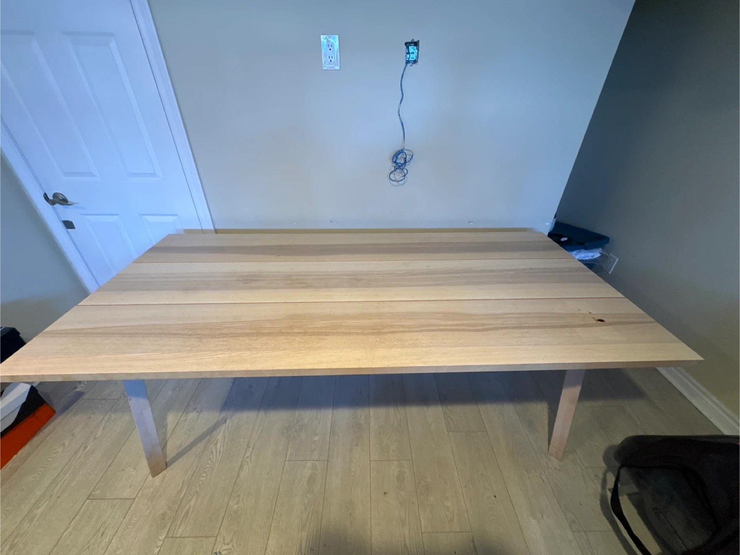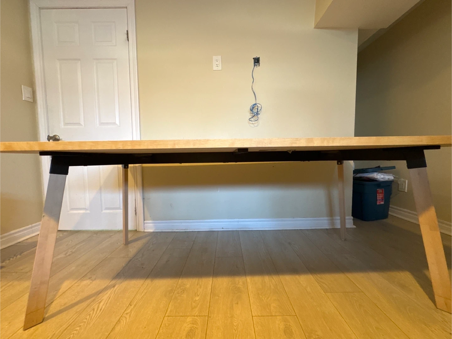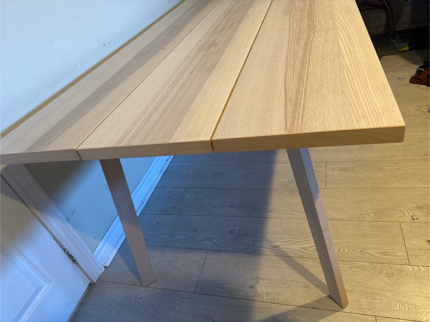 This is a sturdy solid wood table with a natural finish. It's constructed from several planks, offering a unique look. The table has angled wooden legs for support. It's great for dining or as a work surface.