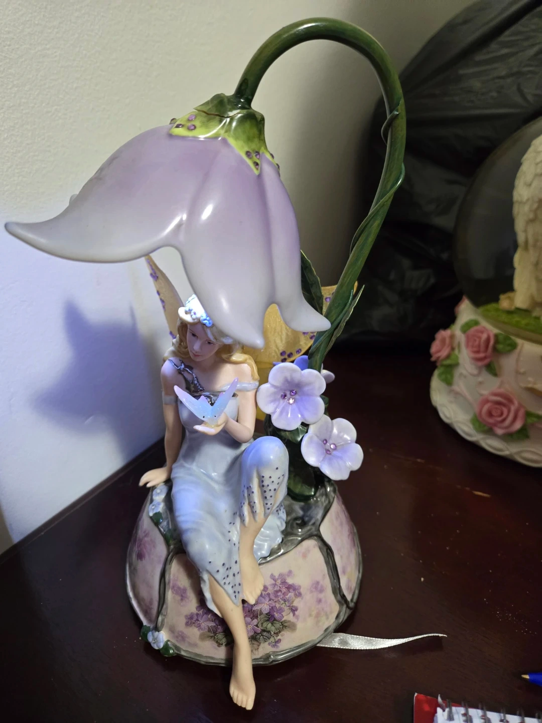 This decorative piece features a fairy sitting beside a flower lamp. It's designed with intricate details and pastel colours. The lamp part has a pale purple bloom with green accents.