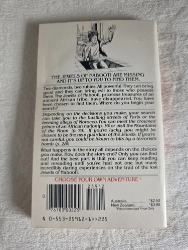 Step into the world of mystery and adventure with this vintage 1981 printing of The Lost Jewels of Nabooti, one of the earliest entries in the legendary Choose Your Own Adventure book series by R.A. Montgomery. Featuring cover art by Paul Granger, this edition lets you decide your fate through 36 possible endings — a true classic from the golden age of interactive fiction. Two diamonds. Two rubies. All powerful. The priceless Jewels of Nabooti have vanished — and it’s up to you to recover them! Your choices lead you through ancient African ruins, Moroccan streets, and mysterious caverns filled with danger and magic. Each decision could lead to glory… or doom. This is a paperback with 115 pages. It's in very good condition with light cover wear and mild page aging, but the binding is intact and the interior is unmarked.