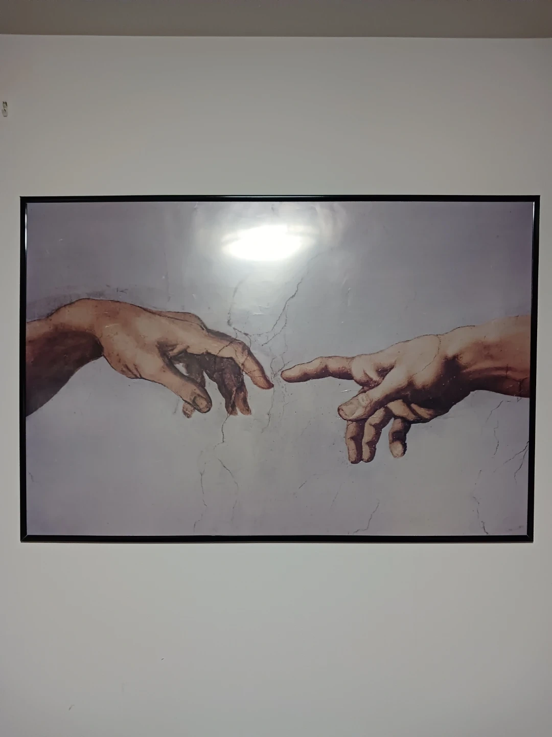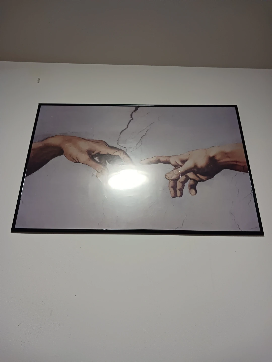 Large framed wall art featuring the iconic hands reaching toward each other design. This piece adds a timeless, elegant touch to any space and works great in living rooms, bedrooms, offices, or studios. Clean neutral tones make it easy to match with modern, minimalist, or classic decor styles.