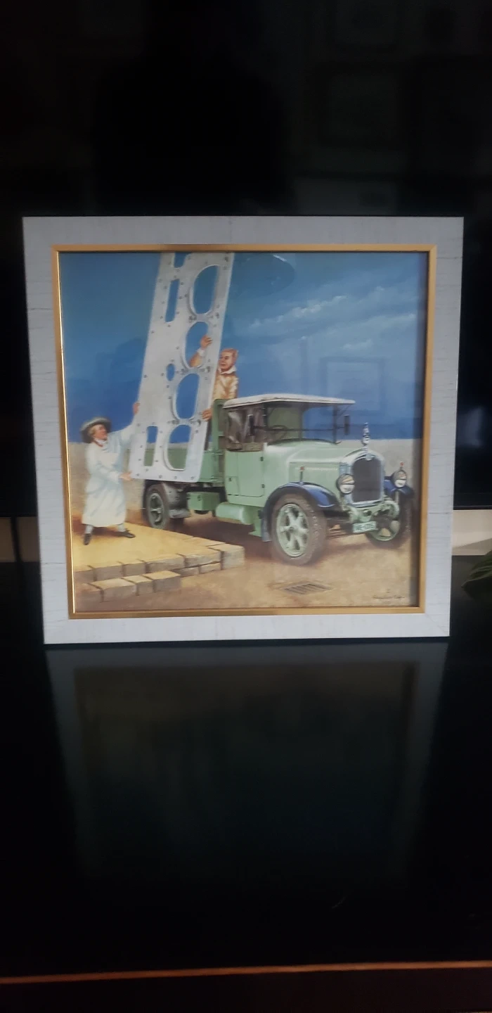 This framed print depicts a vintage green truck with two workers handling a large metal piece. It's a charming scene for any enthusiast of historical transportation or industrial art. The print is ready to hang.