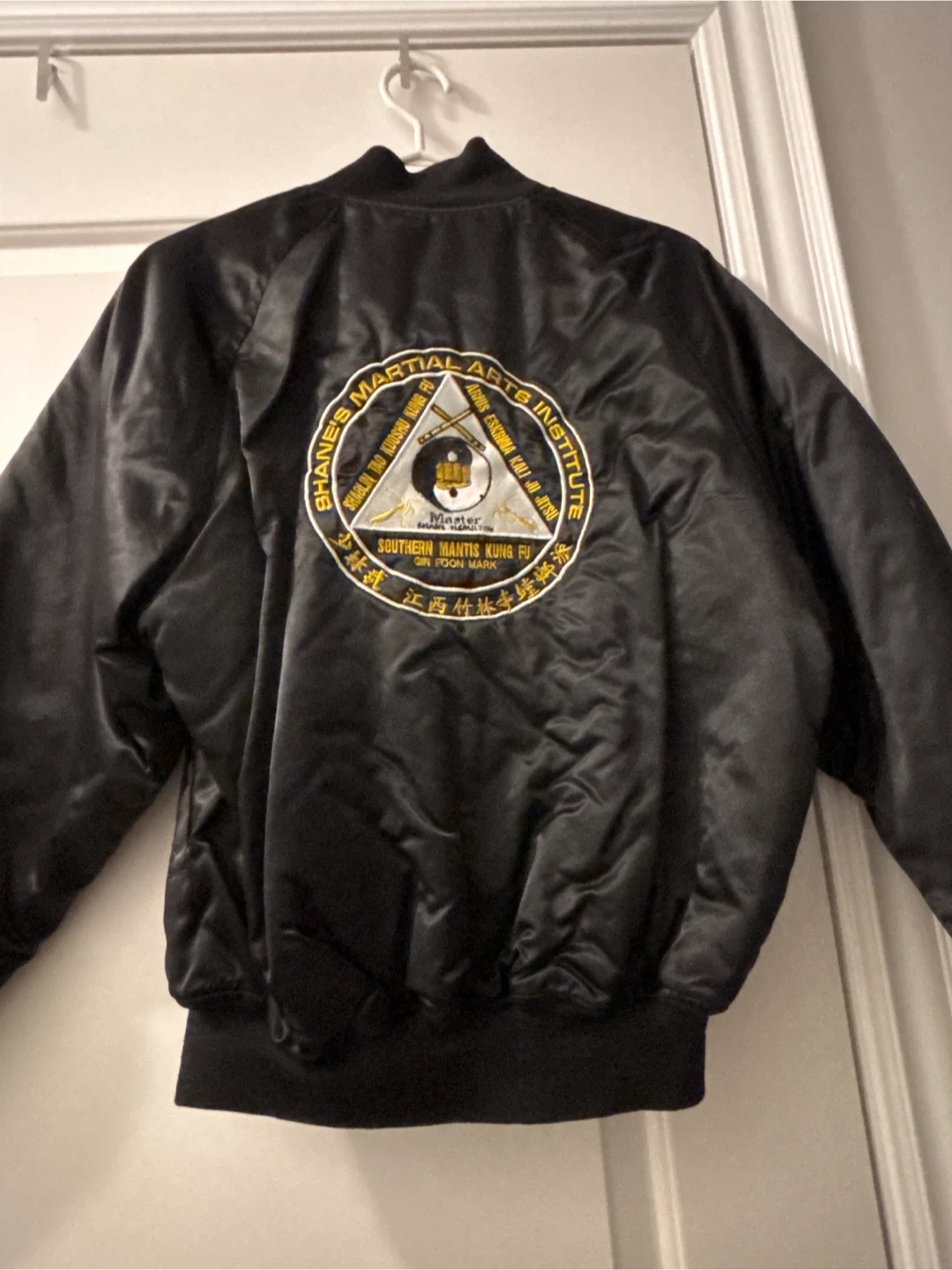 Selling a black jacket from Shane's Martial Arts Institute. It features the institute's logo on the back and the name 'Chase' embroidered on the front. A unique vintage piece.