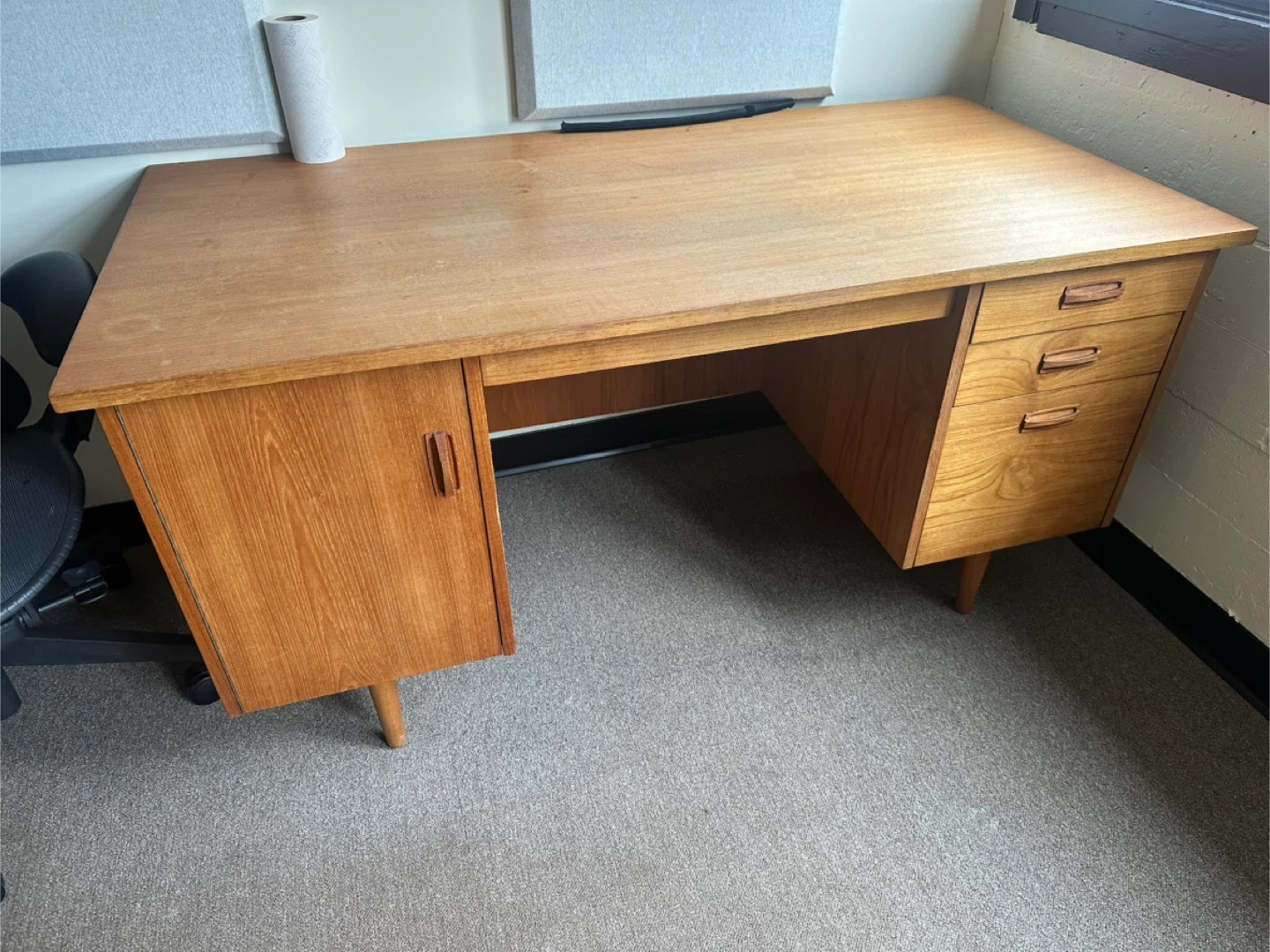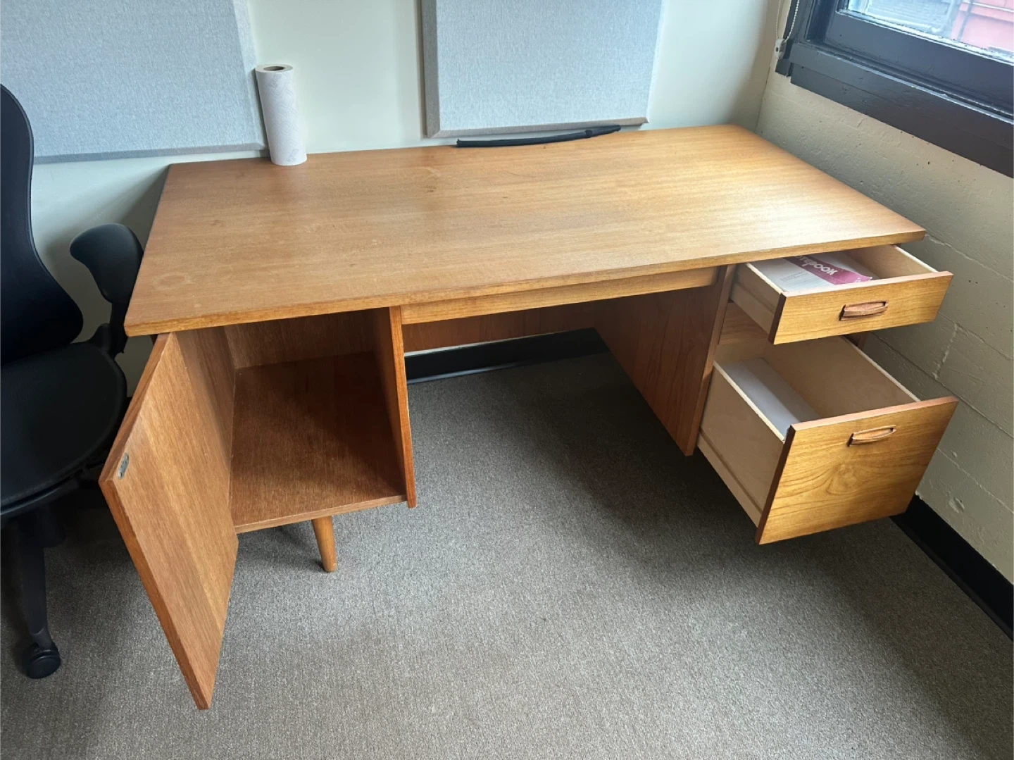 This is a vintage wooden desk with ample storage space. It features a cabinet and drawers for organization. This desk is perfect for a home office or study.