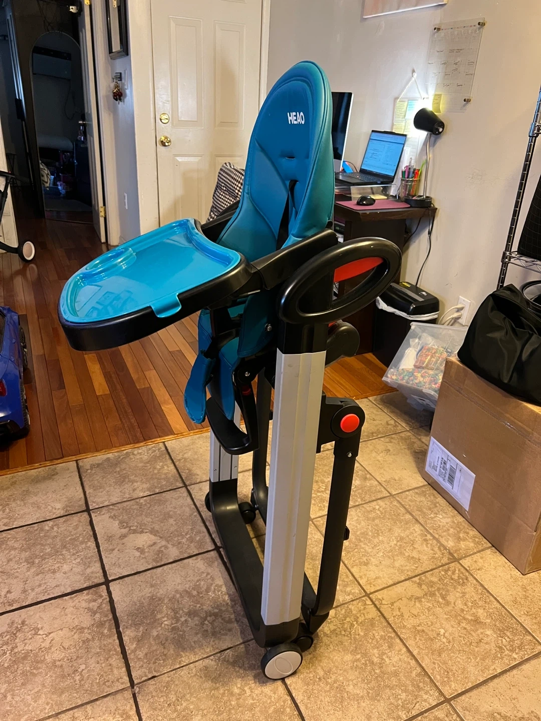 Modern HEAO high chair in beautiful teal color. Very sturdy with a wide, stable base and smooth-rolling back wheels for easy movement. Features a padded seat with safety harness, large removable tray with cup holder, and easy-wipe surfaces for quick cleanups.