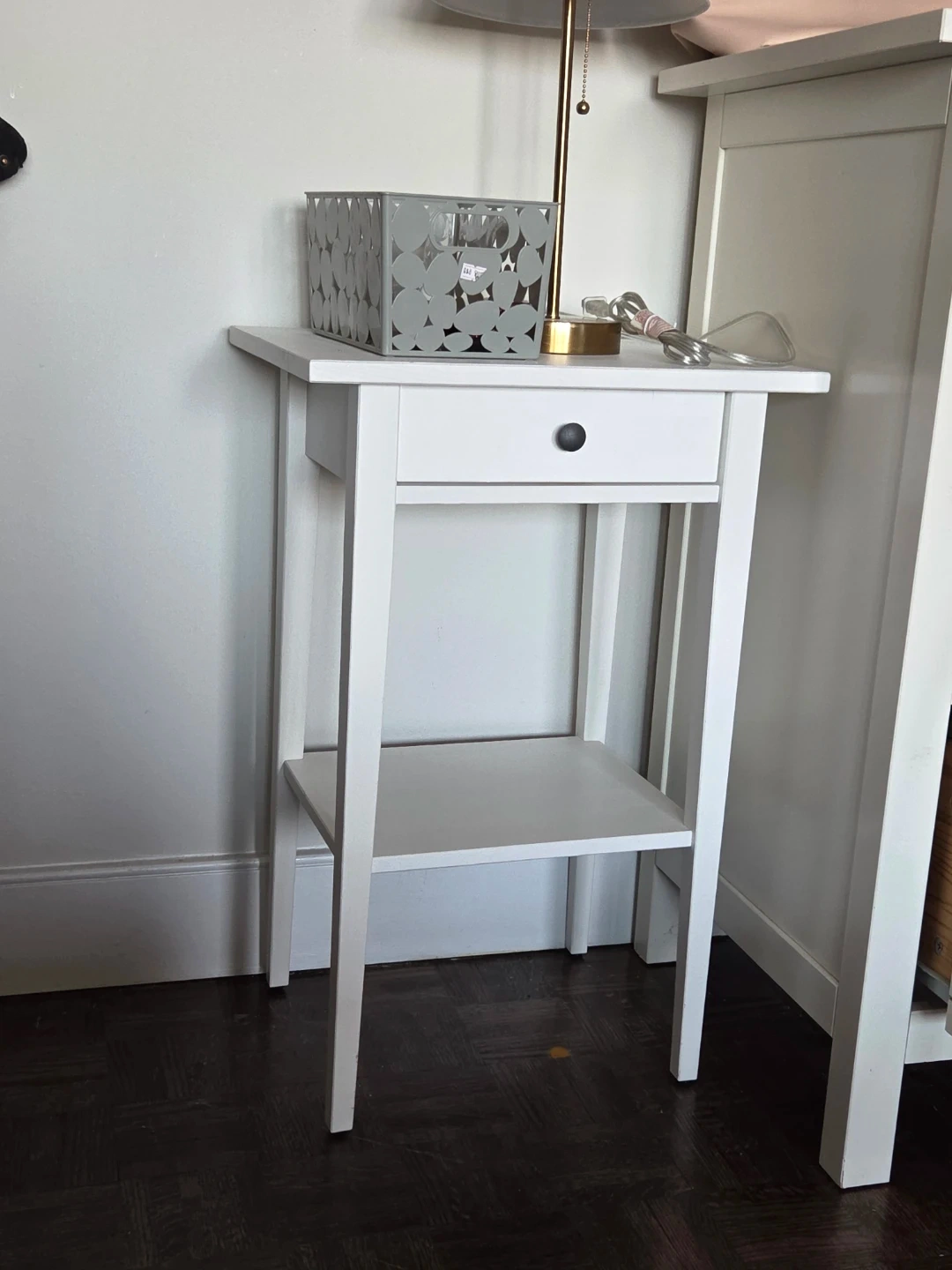 This is a clean white wooden side table. It's got one drawer with a black knob and an open shelf below. Made of wood. Perfect for a nightstand or accent table!