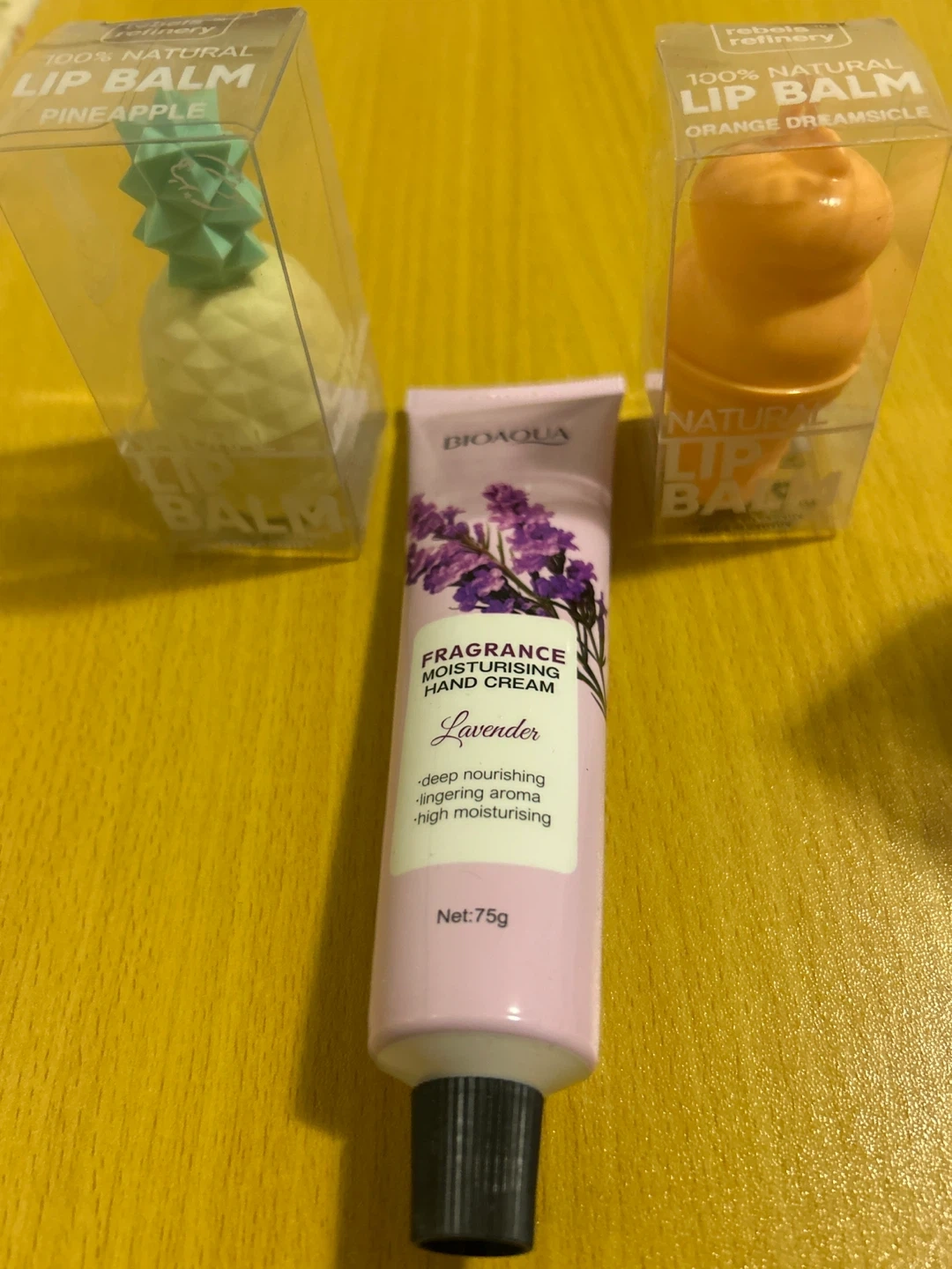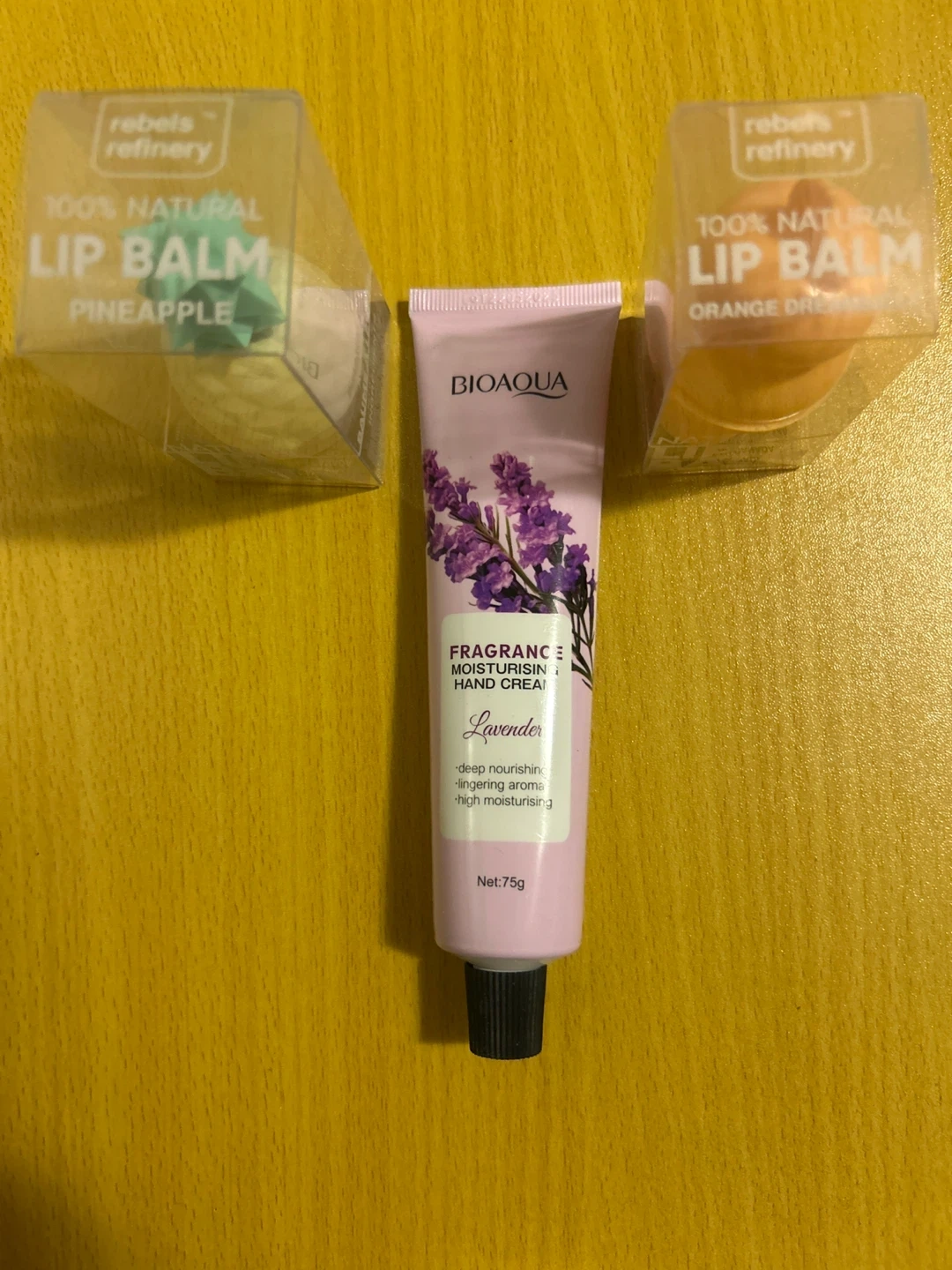 A tube of Bioaqua Lavender Fragrance Moisturising Hand Cream, 75g. Includes two 100% natural lip balms, one pineapple and one orange dreamsicle flavour. Great for keeping your hands and lips soft and hydrated!